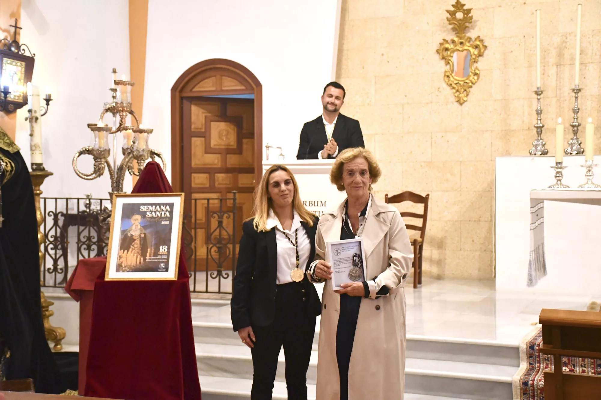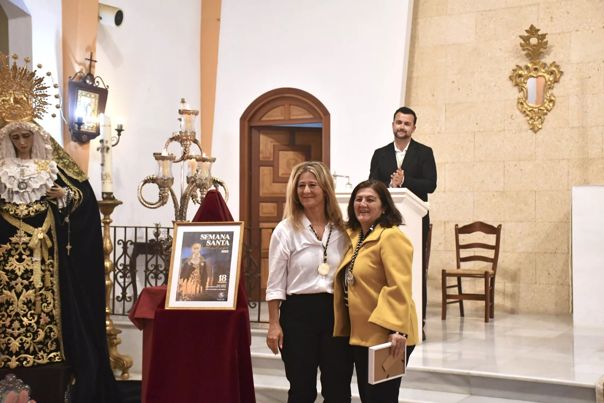 La concejal delegada del Valle del Guadiaro, Eva Gil, y otros ediles de la Corporación asistieron a esta misa, que fue oficiada por el párroco Juan Ramón Rouco. El presidente de la asociación parroquial de Guadiaro, Francisco Javier Godino, se encargó de presentar el cartel. Además, varios miembros de la asociación entregaron reconocimientos a personas muy vinculadas al colectivo religioso, entre ellas a la autora del cartel, Ana María Luque.