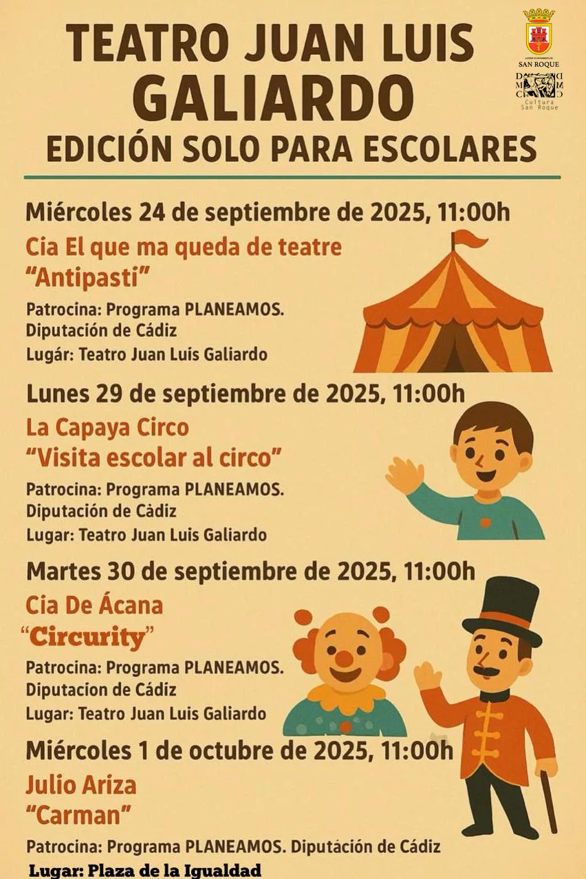 El alumnado de todos los colegios del municipio ha sido invitado a asistir a los cuatro espectáculos de la décima edición del Sanrotín, el Festival de Títeres y otras Pequeñeces de San Roque. Dedicado al mundo del circo, entre el 24 y el 30 de septiembre habrá tres funciones en el Teatro Juan Luis Galiardo, y una sesión final en la Plaza de la Igualdad el 1 de octubre