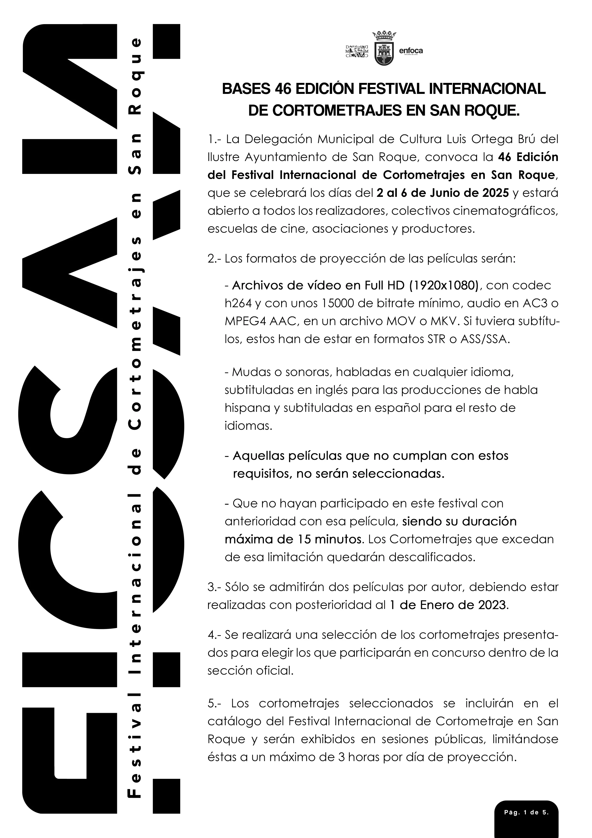 En las bases de la 46 Edición del Festival Internacional de Cortometrajes en San Roque se recoge que se celebrará del 2 y el 6 de junio de 2025 y estará abierto a todos los realizadores, colectivos cinematográficos, escuelas de cine, asociaciones y productores.