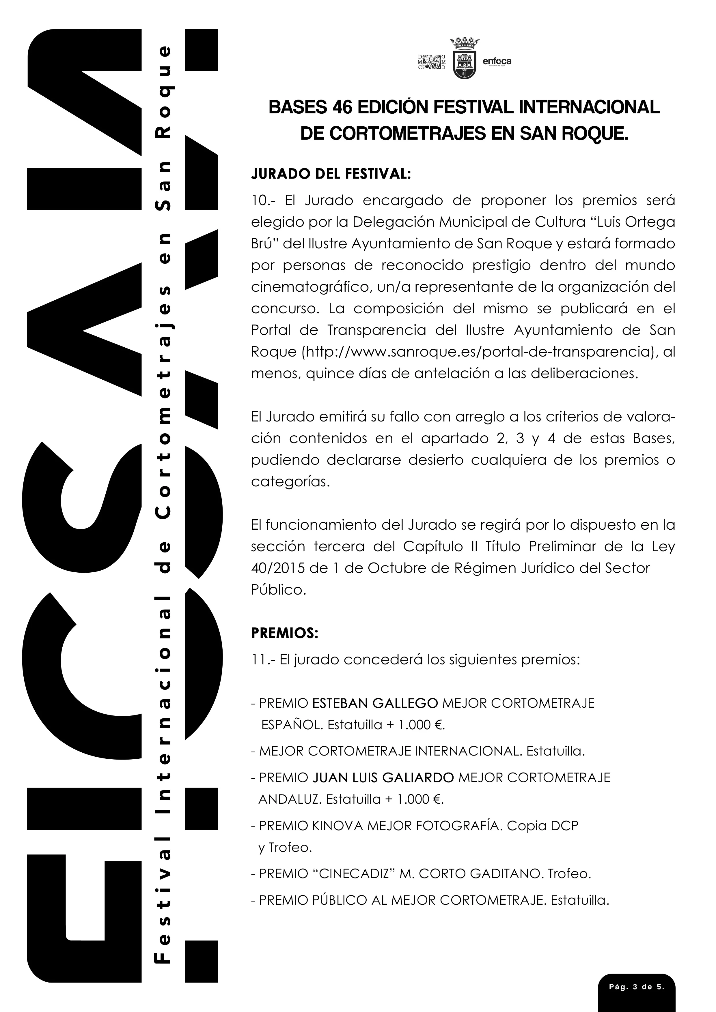 El jurado encargado de proponer los premios será elegido por la Delegación Municipal de Cultura y estará formado por personas de reconocido prestigio dentro del mundo cinematográfico, así como por un representante de la organización del concurso. La composición del mismo se publicará en el Portal de Transparencia del Ilustre Ayuntamiento de San Roque al menos con quince días de antelación a las deliberaciones. El jurado podrá declarar desierto cualquiera de los premios o categorías.