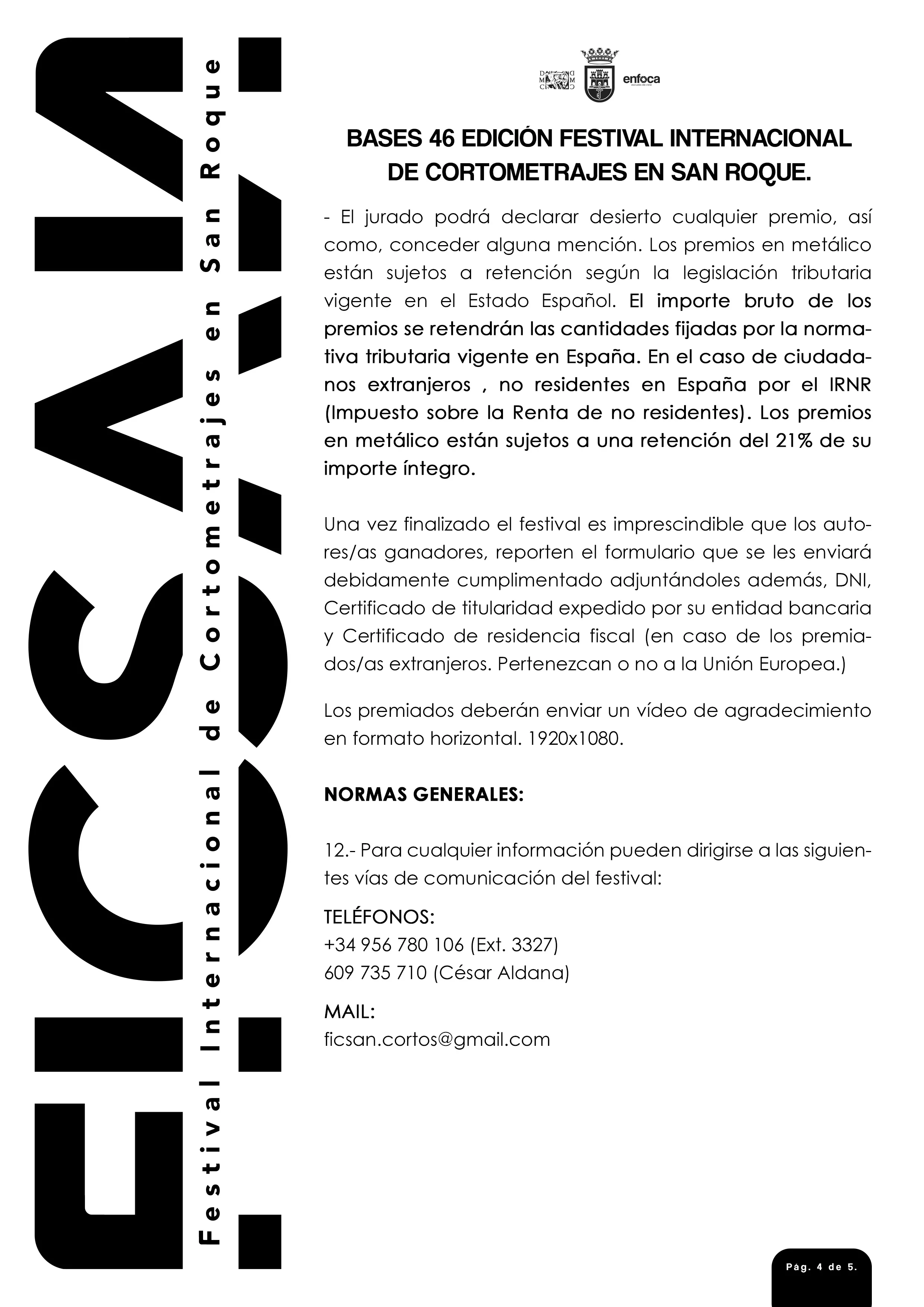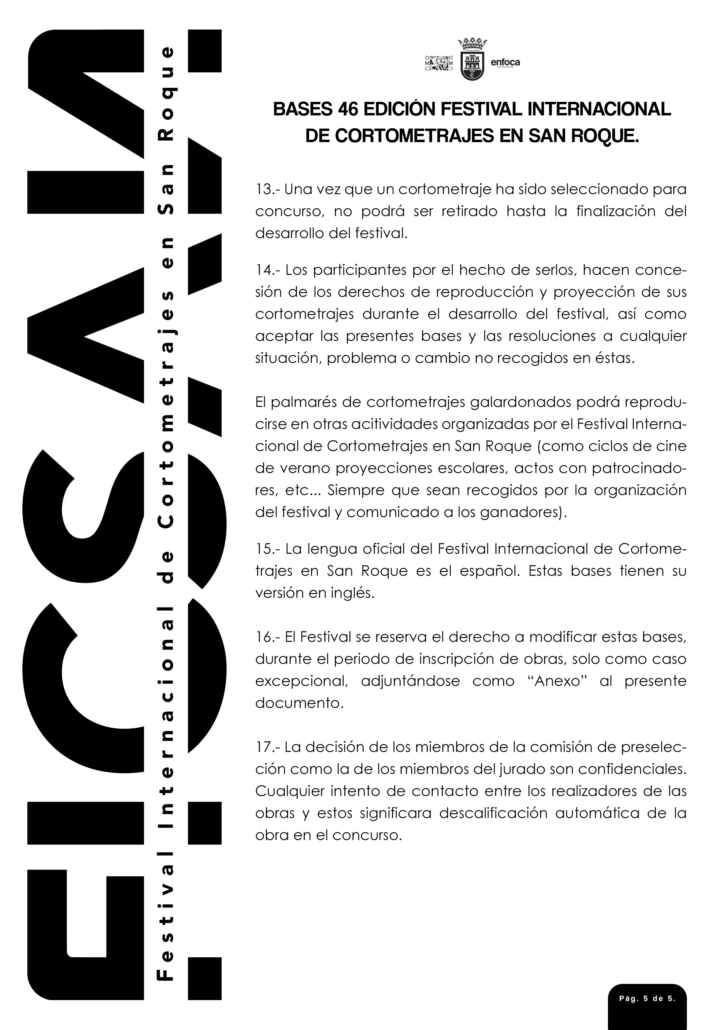 Los participantes por el hecho de serlos, hacen cesión de los derechos de reproducción y proyección de sus cortometrajes durante el desarrollo del festival, así como aceptar las presentes bases, y las resoluciones a cualquier situación, problema o cambio no recogidos en éstas. El palmarés de cortometrajes galardonados podrá reproducirse en otras actividades organizadas por el Festival Internacional de Cortometrajes en San Roque (como Ciclos de Cine de Verano, proyecciones con Escolares, actos con patrocinadores, etc).