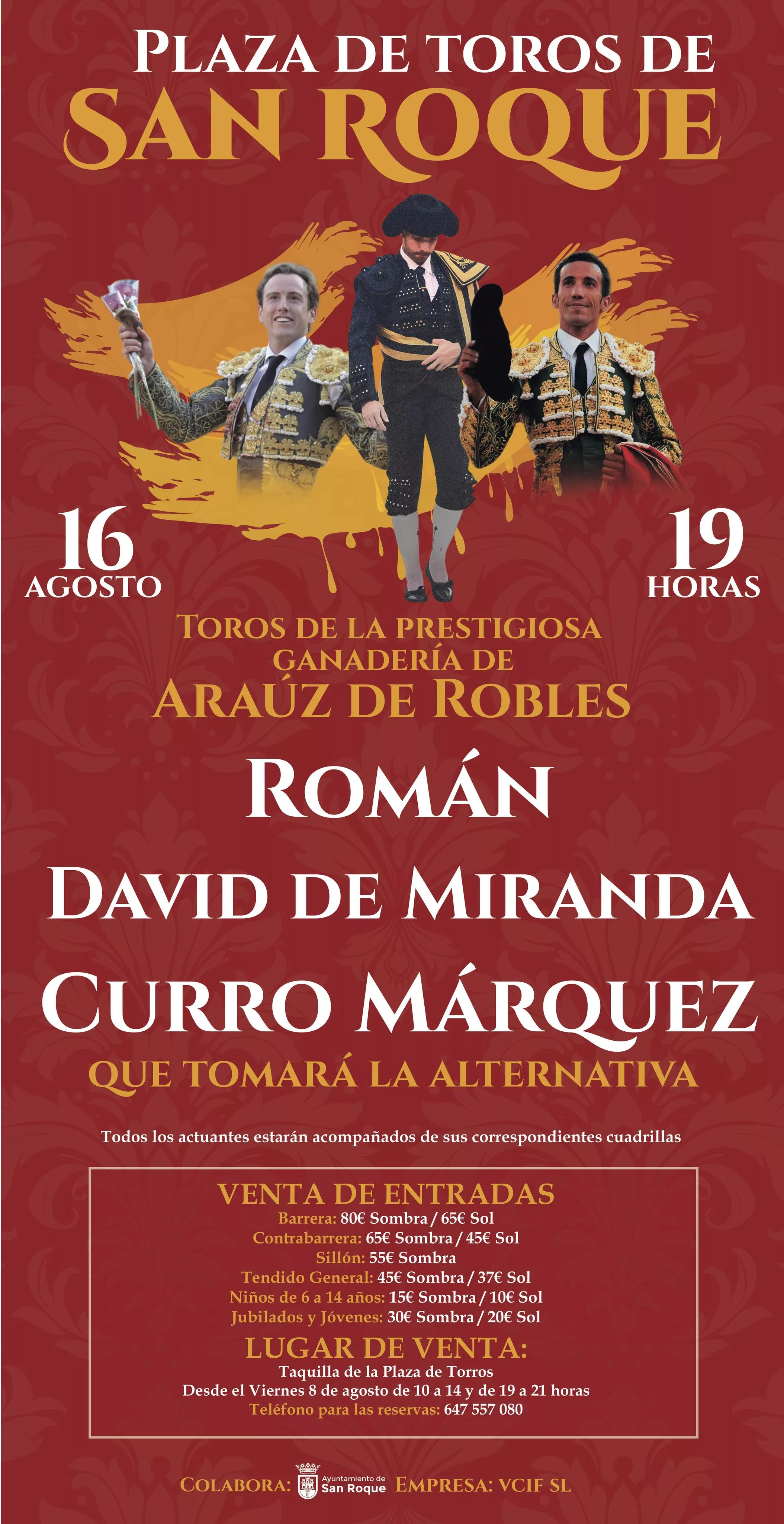 Los diestros Román, David de Miranda y Curro Márquez, que tomará la alternativa, protagonizan el cartel de la corrida de toros de la Feria Real de San Roque 2025. Se lidiarán seis toros de la ganadería jiennense de Araúz de Robles, en un espectáculo que tendrá lugar el sábado 16 de agosto a partir de las 19.00 horas. El Ayuntamiento facilitará un año más la asistencia a los toros de 400 mayores del municipio por tan solo 5 euros.