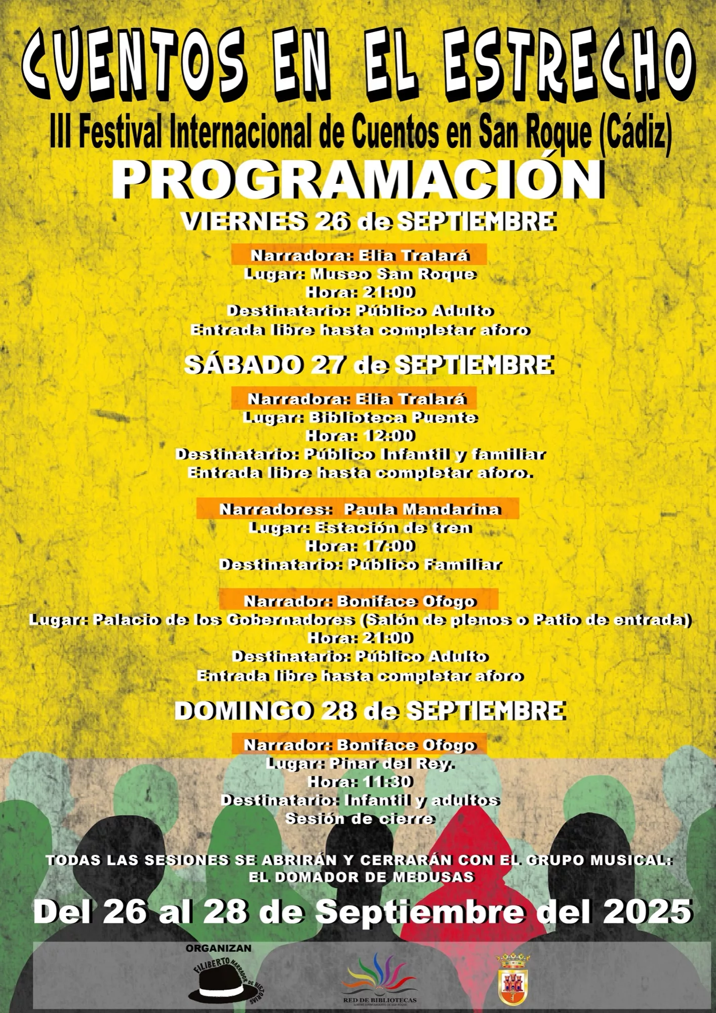 San Roque acogerá el III Festival Internacional “Cuentos en el Estrecho”, un encuentro de narradores que tendrá lugar del 26 al 28 de septiembre. Organizado por la Red de Bibliotecas y por Filiberto Chamorro, habrá cuentacuentos para todas las edades, así como música en directo y una sesión de cierre en el Pinar del Rey.