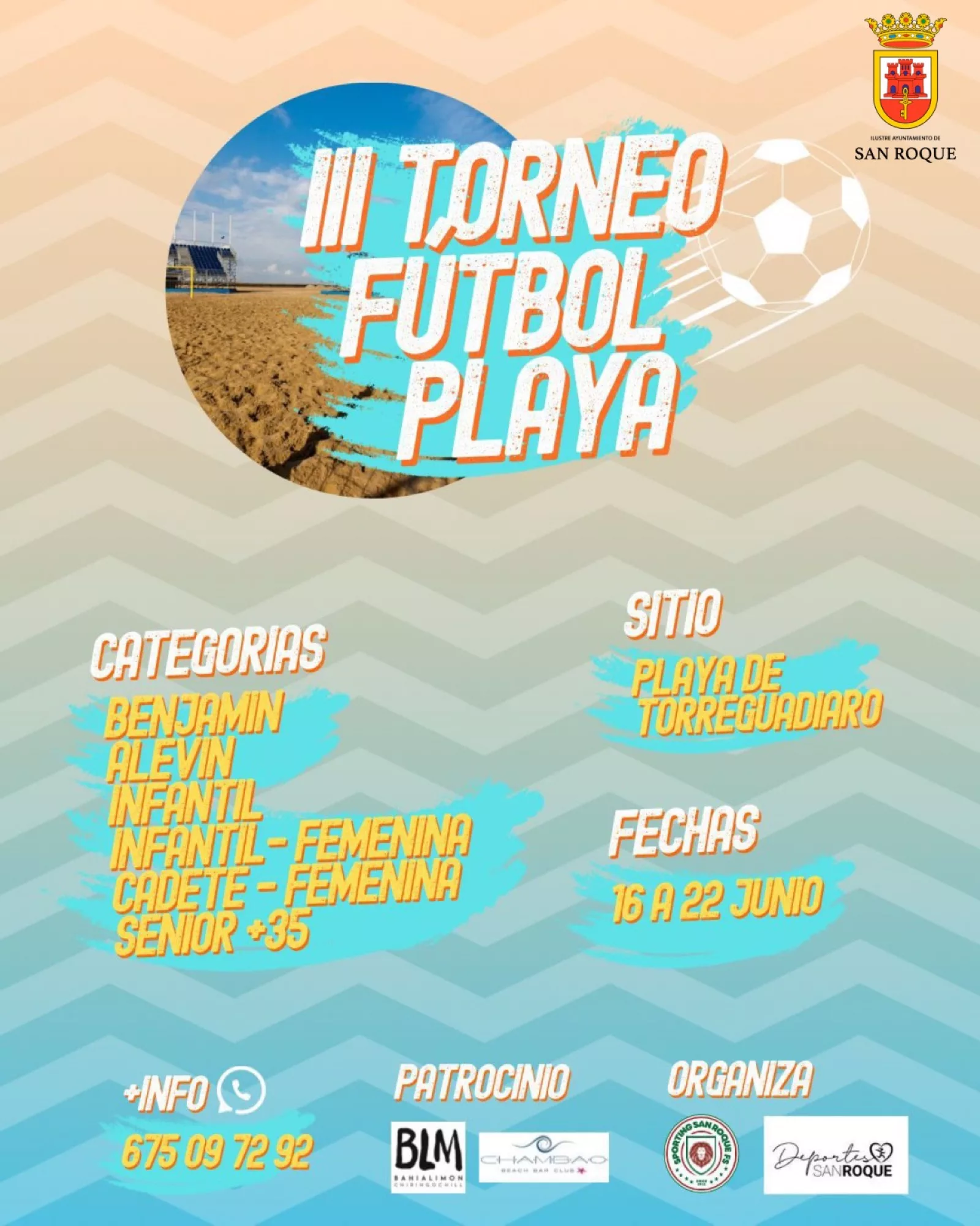 El torneo de Fútbol Playa “Alcalde, Ciudad de San Roque” abre su plazo de incripción. Esta tercera edición se va a celebrar en la playa de Torreguadiaro del 16 al 22 de junio. Los interesados pueden apuntarse en el siguiente formulario: https://docs.google.com/forms/d/e/1FAIpQLSe6i-8PtQqXIky8iBJ5PuTG27BwfMQr6aFJWyd6X46BuDye8g/viewform