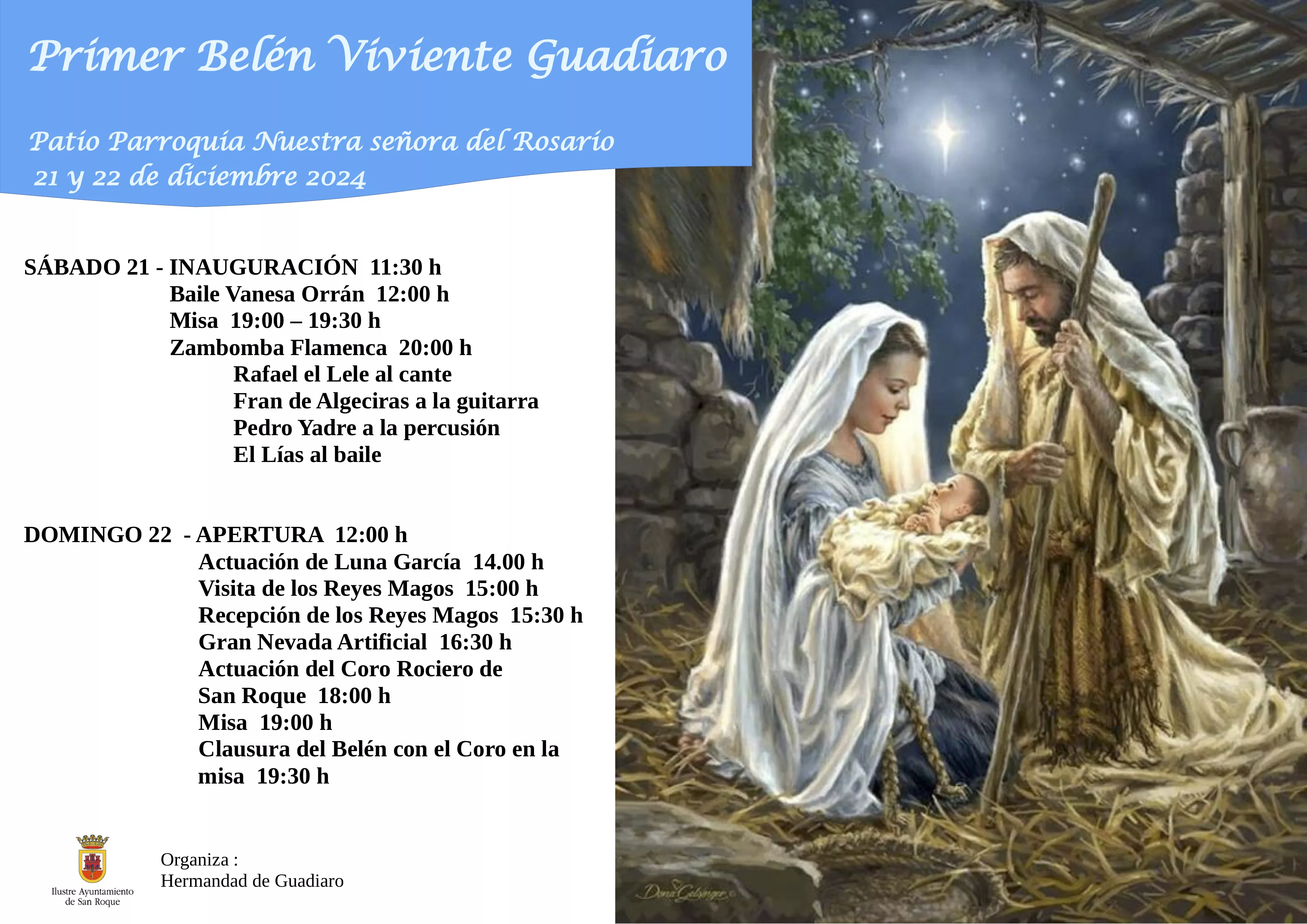 Guadiaro celebrará este año su primer Belén Viviente, que tendrá lugar el sábado 21 y domingo 22 en el patio de la parroquia Nuestra Señora del Rosario. Está organizado por la Hermandad de Guadiaro y cuenta con la colaboración del Ayuntamiento.