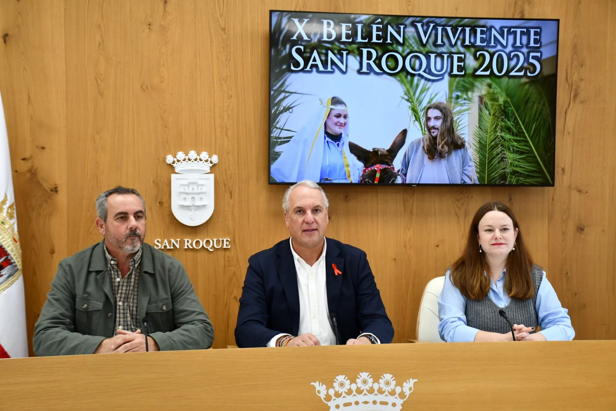 El alcalde, Juan Carlos Ruiz Boix, el hermano mayor de la Hermandad de Nuestra Señora del Rocío de San Roque, Miguel Ángel Andana, y la concejal de Participación Ciudadana, Rocío Fernández, han presentado este lunes el X Belén Viviente San Roque 2025, una actividad que no pudo celebrarse el año pasado debido al mal tiempo. El fin de semana del 13 y el 14, la Plaza de Armas y los alrededores de la iglesia del Casco Histórico se llenarán de puestos y figurantes ambientados como en una antigua aldea judía.
