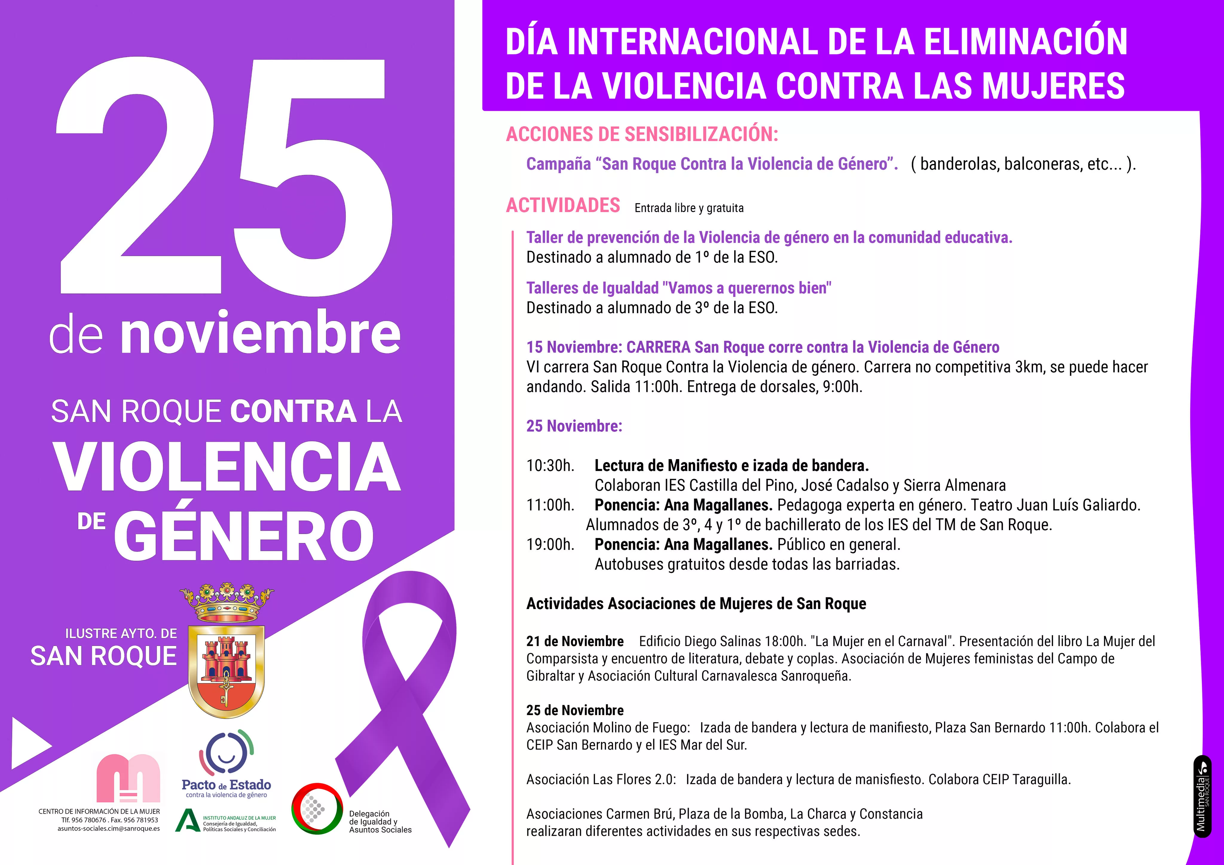 En cuanto al 25 de noviembre, los actos comenzarán a las 10:30 horas con la lectura del manifiesto y la izada de bandera en la plaza de las Constituciones, actos con los que se cuenta con la colaboración de los IES Castilla del Pino, José Cadalso y Sierra Almenara. A las 11:00 horas se contará con la ponencia en el teatro Juan Luis Galiardo de la pedagoga experta en género Ana Magallanes, dirigida a los alumnos de 3º,4º de la ESO y 1º de bachillerato de los IES de San Roque. Por la tarde, a las 19:00 horas y para el público en general Ana Magallanes impartirá una nueva ponencia.