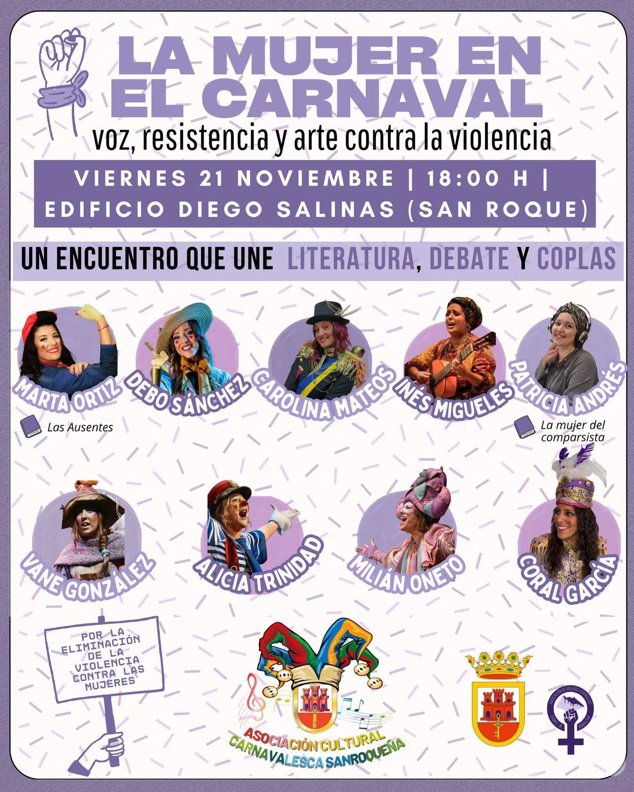 El 21 de noviembre en el Edificio Diego Salinas, a partir de las 18:00 horas, tendrá lugar la jornada “La mujer en el carnaval. Voz, resistencia y arte contra la violencia ” que contará con la presentación del libro “La mujer del comparsista”, obra de Patricia Andrés, junto a un encuentro de literatura, debate y coplas. Esta actividad está organizada por la Asociación de Mujeres Feministas del Campo de Gibraltar y la Asociación Cultural Carnavalesca Sanroqueña. En esta jornada se contará con la participación de Marta Ortiz, Debo Sánchez, Carolina Mateos, Inés Migueles, Vane González, Alicia Trinidad, Milián Oneto y Coral García.