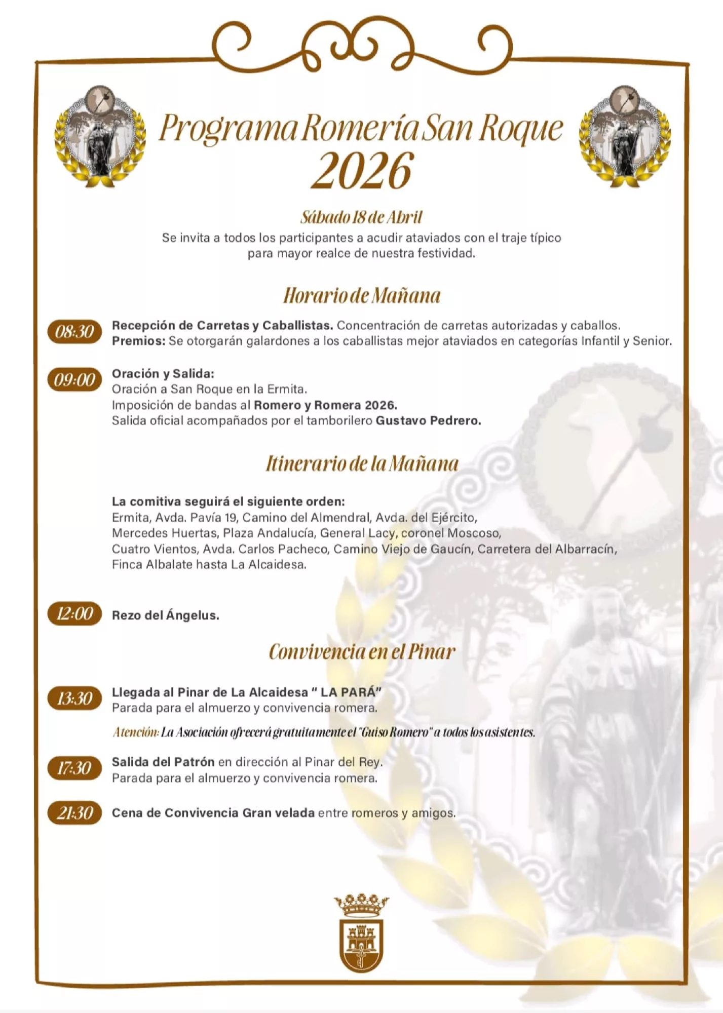 La Romería de San Roque 2026 comenzará el sábado a las 8:30 horas con la recepción de carretas y caballistas junto a la ermita del Patrón. A las 9:00 horas se procederá a la Oración a San Roque en la puerta de la ermita y a la imposición de bandas al Romero y a la Romera 2026. A partir de ahí se llevará a cabo la salida de la comitiva, que contará con la música del tamborillero Gustavo Pedrero.