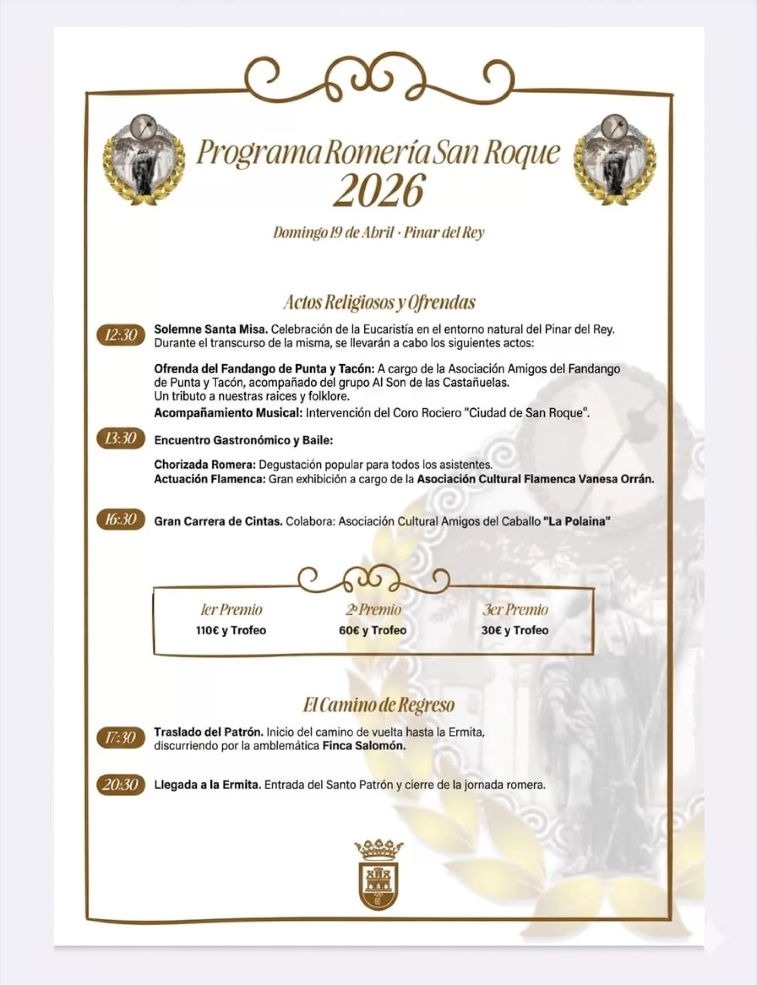 A las 17.30 está prevista la salida del Patrón en dirección al Pinar del Rey, donde se prevé la llegada a las 21.30 horas, para finalizar con una cena de convivencia entre romeros y amigos. Para facilitar la vuelta de los asistentes desde el Pinar a San Roque, habrá servicio de autobús a las 22.15, 23.15, 00.15 y 01.15 horas.