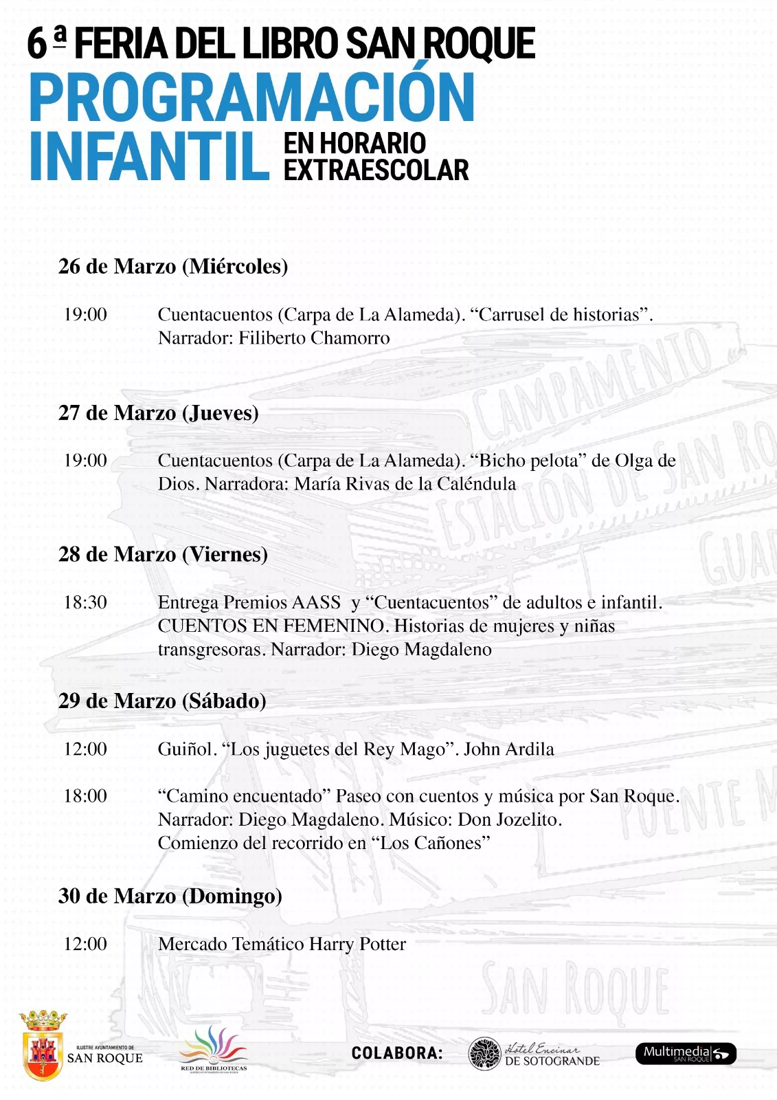 Mañana, miércoles 26 dará comienzo la sexta edición de la Feria del Libro en San Roque y que contará con una nutrida programación hasta el domingo 30 de marzo. La concejal de Bibliotecas, Rocío Fernández, ha desgranado en Canal San Roque Radio el grueso de actividades de dicha feria, con especial detenimiento en la programación infantil que contará con cuentacuentos a diario, guiñol y el Mercado Temático Harry Potter, entre otros.