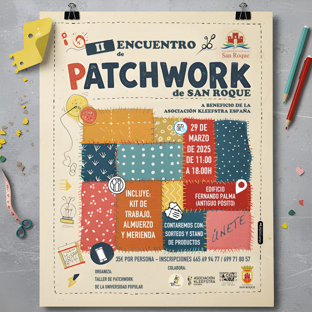 Este sábado 29 de marzo, el edificio Alcalde Fernando Palma acogerá el Segundo Encuentro de Patchwork de San Roque, nuevamente a beneficio de la Asociación Kleefstra España. Se trata de una iniciativa de la Universidad Popular de San Roque junto a la Delegación de Cultura, con la organización del Taller de Patchwork de la UP.