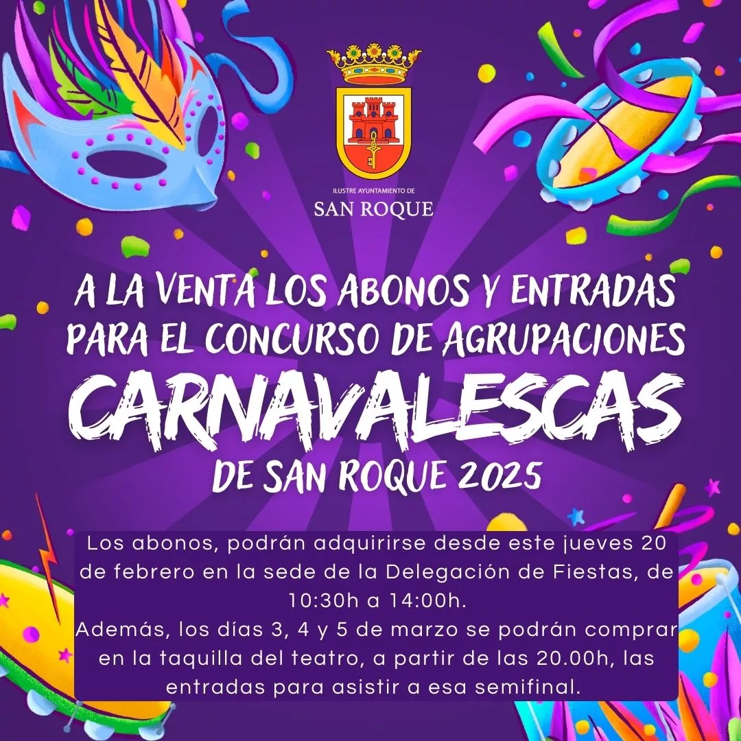 Durante los días 3, 4 y 5 de marzo se desarrollarán en el Teatro Juan Luis Galiardo las semifinales del Concurso Oficial de Agrupaciones Carnavalescas (COAC), mientras que la final será el viernes 7. El Pregón Oficial del Carnaval de San Roque, que incluirá la presentación de la Diosa y de las Ninfas del Carnaval, tendrá lugar el jueves 6 en el citado teatro, siendo el pregonero José Antonio Andrades Blas. Actuarán las chirigotas infantiles de los colegios Carteia y Maestro Apolinar.