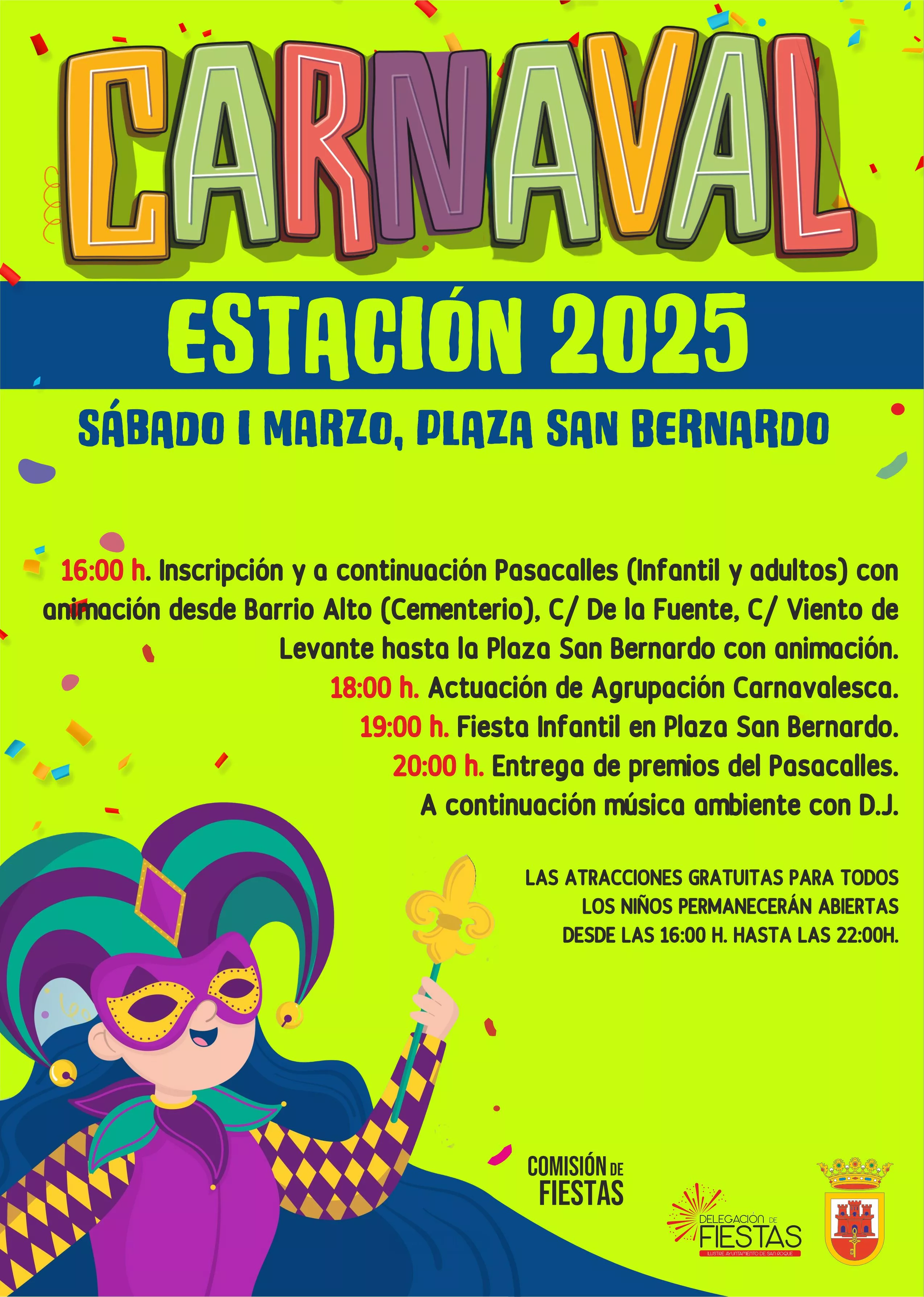 En cuanto al Carnaval de la Estación, tendrá lugar el sábado 1 de marzo en la Plaza de San Bernardo. Las atracciones gratuitas para los niños estarán abiertas desde las 16.00 horas y hasta las 20.00. A las 16.00 horas tendrá lugar la inscripción en el pasacalles infantil y adultos, que comenzará a la altura del cementerio de la barriada, y bajará por Barrio Alto, calle de La Fuente y Viento de Levante, para finalizar en la Plaza San Bernardo.