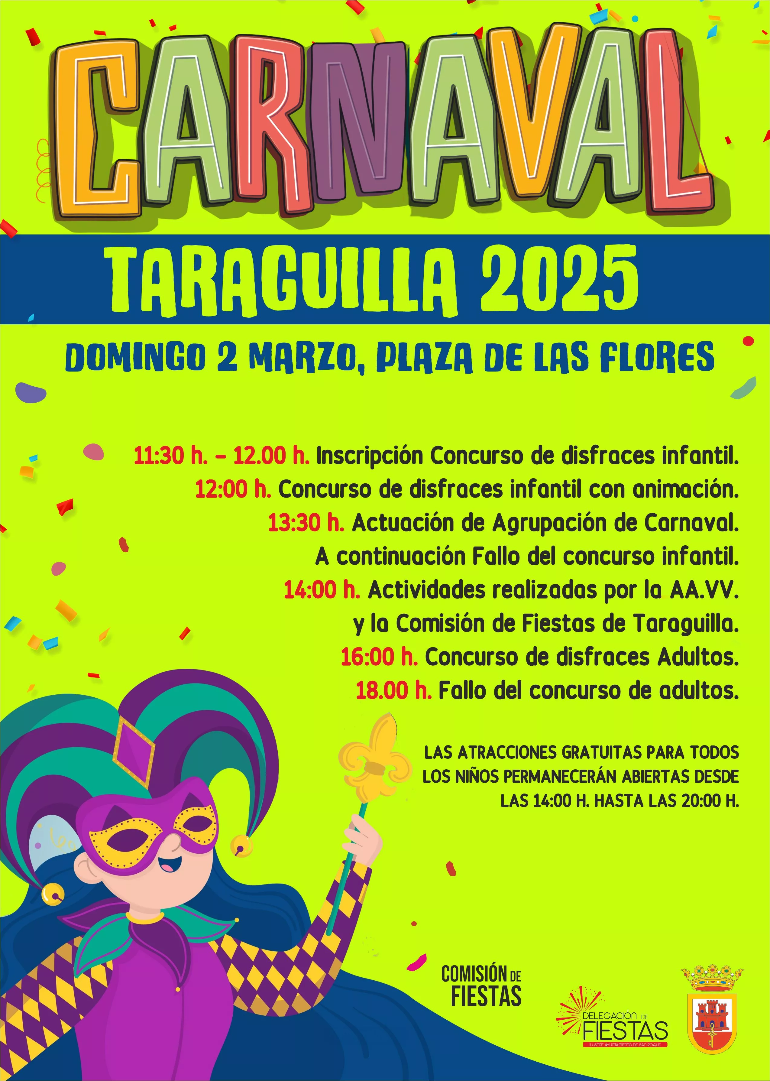 El Carnaval de Taraguilla tendrá lugar el domingo 2 de marzo en la Plaza de las Flores. Entre las 11.30 y las 12.00 será la inscripción del concurso de disfraces infantil, que comenzará a mediodía contándose con animación. A las 13.30 está prevista la actuación de una agrupación carnavalesca, y a continuación se entregarán los premios del certamen infantil.