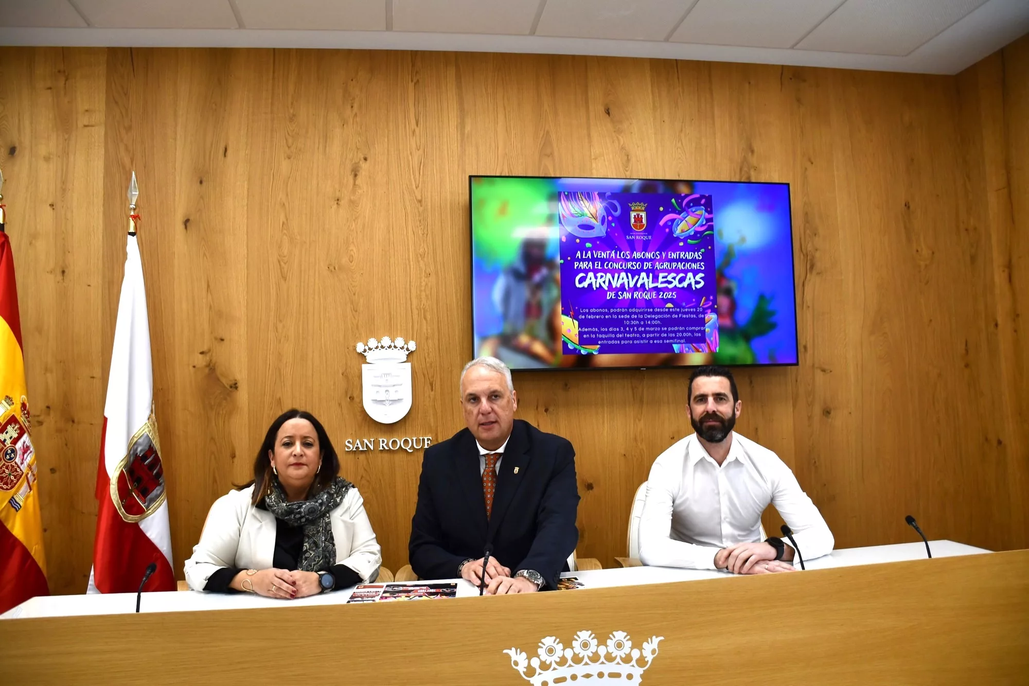 El alcalde, Juan Carlos Ruiz Boix, ha presentado la programación de los carnavales de San Roque, que se celebrarán entre el 1 y el 9 de marzo tanto en San Roque Ciudad como en cinco barriadas del municipio. El primer edil estuvo acompañado en la presentación de la teniente de alcalde de Fiestas, María del Mar Collado, y del de Juventud, David Ramos.