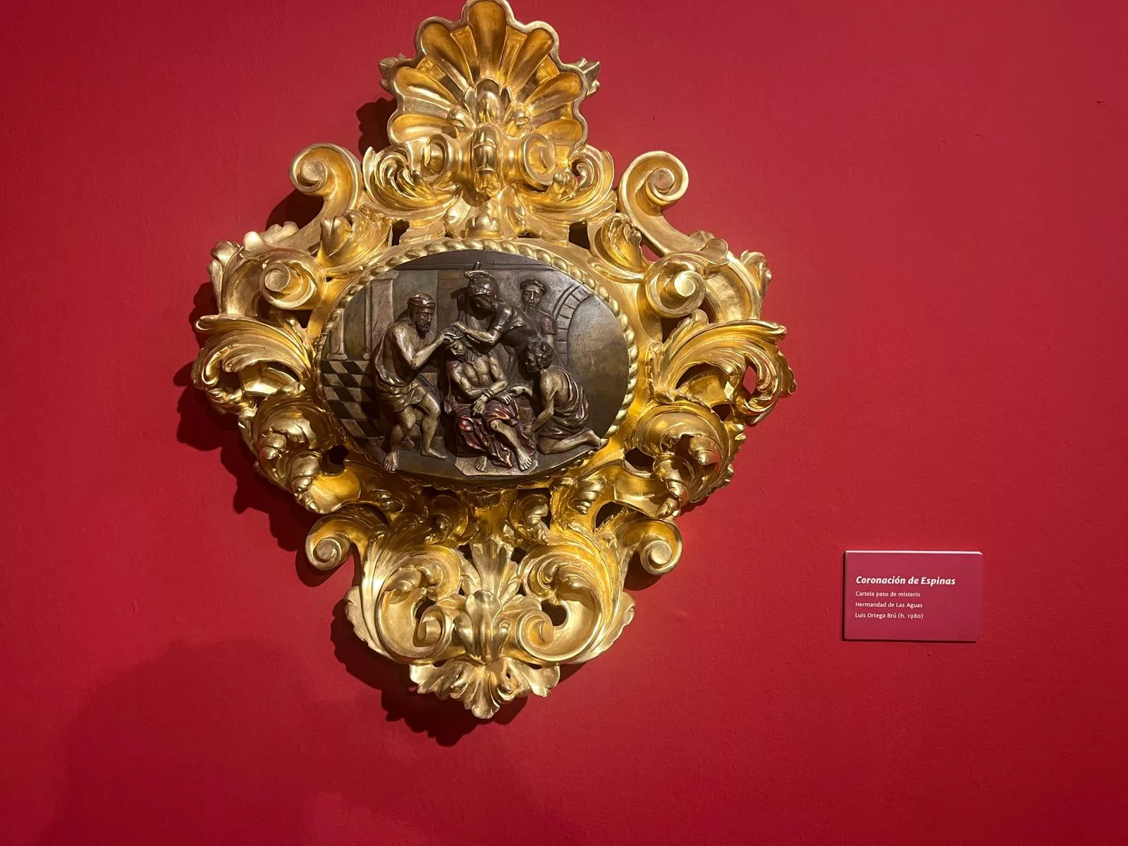 Varias de las piezas expuestas son obra del insigne imaginero sanroqueño Luis Ortega Bru, entre ellas, “Coronación de espinas” una “Cartela de paso de misterio” de la Hermandad de las Aguas.