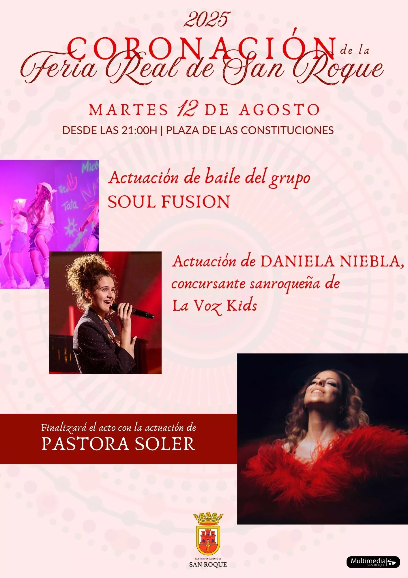 En cuanto al Acto de Coronación, tendrá lugar el martes 12 en la Plaza de las Constituciones a partir de las 21.30 horas, tras la copa de bienvenida a cargo del Venenciador. Posteriormente, el Pregón Oficial de la Feria Real correrá a cargo de José Francisco Román Núñez «El Pelao”, habrá una actuación de Daniela Niebla, concursante sanroqueña de La Voz Kids, y espectáculo de baile de Soul Fusion. La noche cerrará con la actuación especial de Pastora Soler a las 23.30 horas. Será un espectáculo concebido especialmente para esta ocasión tan destacada, y adaptado a la singularidad del evento y del entorno. Un verdadero privilegio para San Roque recibir a una artista de su trayectoria y sensibilidad, cuya presencia engrandecerá aún más uno de los actos más emblemáticos de nuestras fiestas.