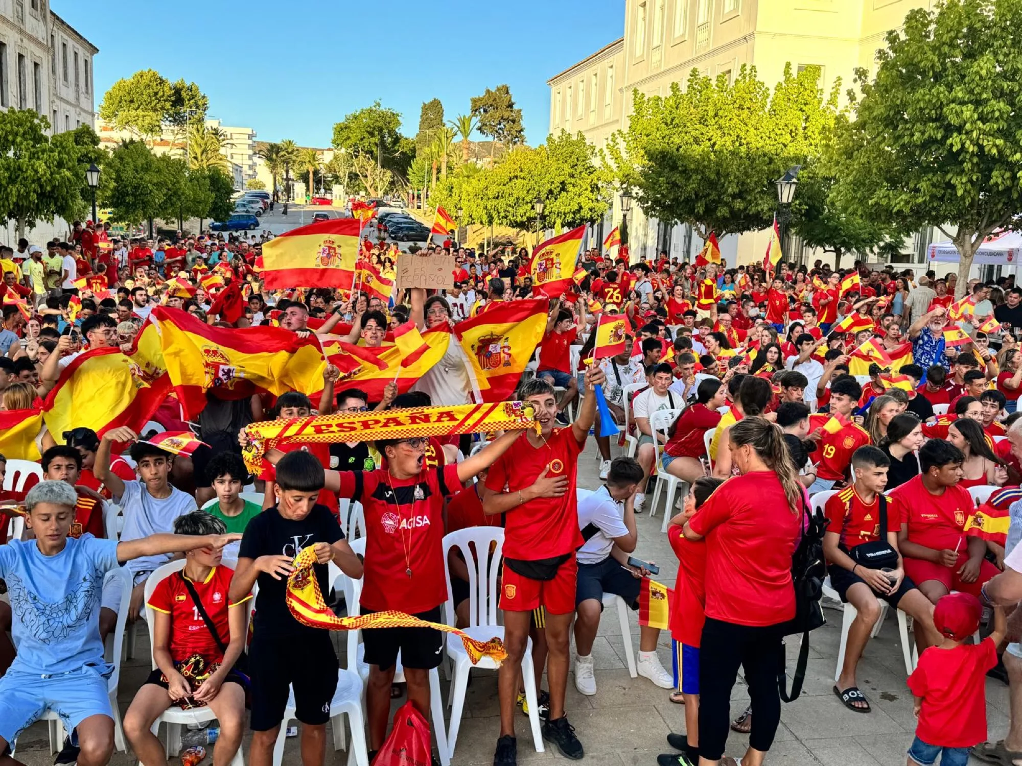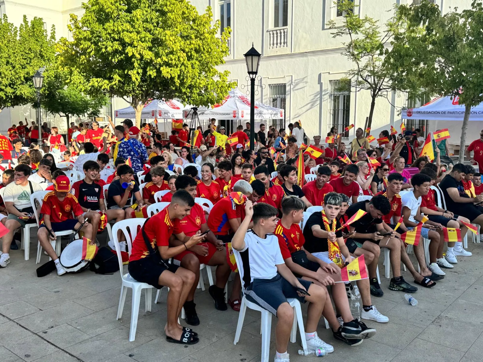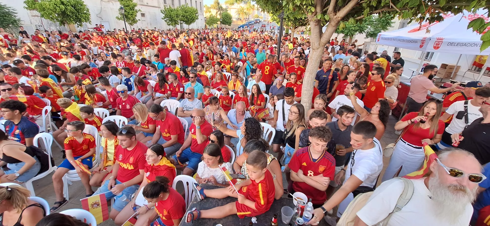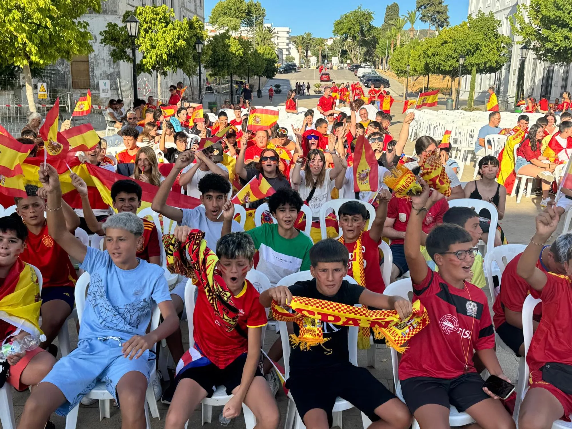 Miles de personas, la mayoría vistiendo los colores de la Selección Española, han apoyado este domingo a La Roja en la sanroqueña Plaza de las Constituciones, y han celebrado por todo lo alto la victoria sobre Inglaterra del equipo de Luis de la Fuente por 2 a 1. El Ayuntamiento había montado una fiesta para esta celebración, con pantalla gigante, pintacaras y música de Dj.