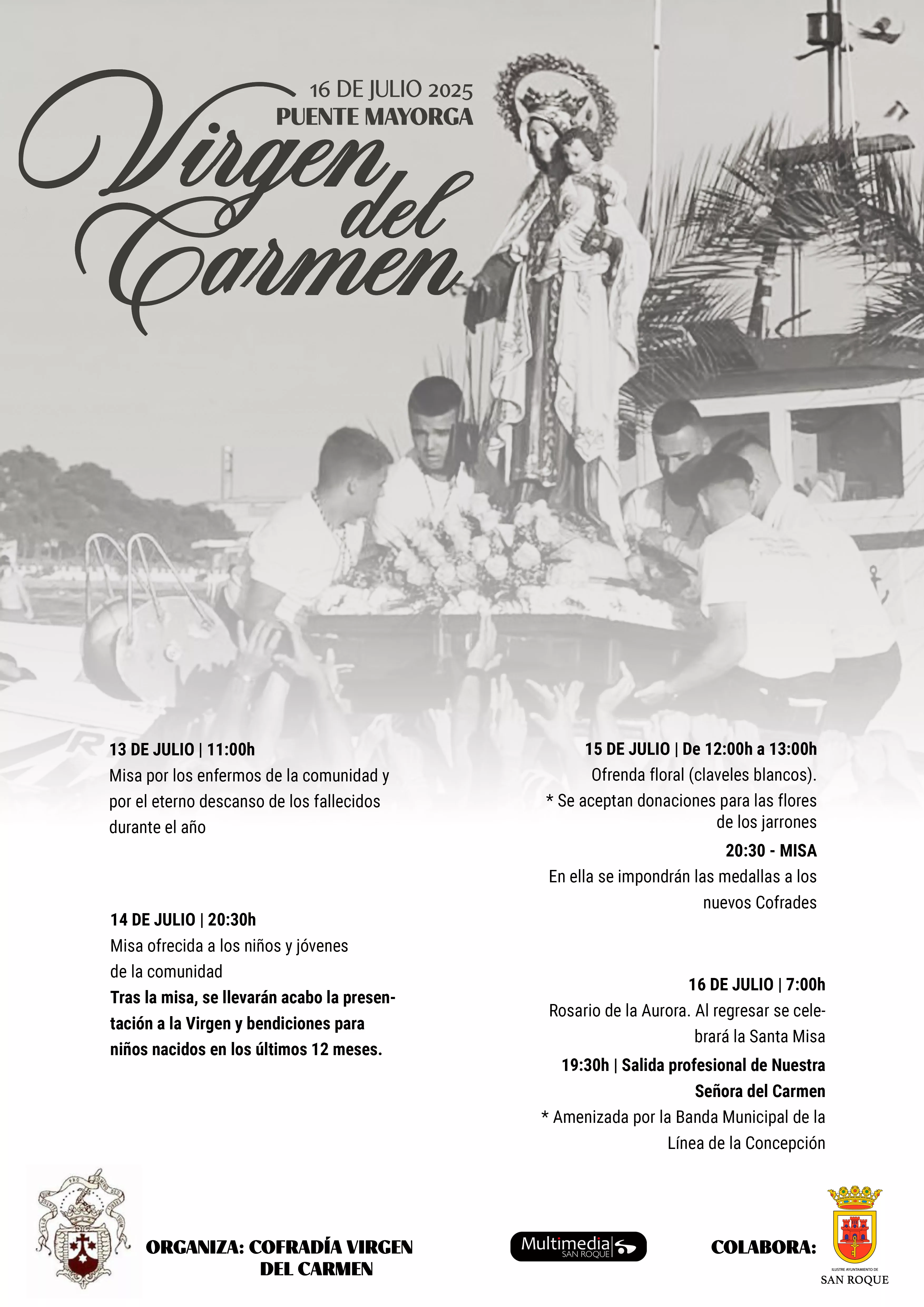 Además, en Puente Mayorga, el día de la virgen, miércoles 16 de julio, tendrá lugar el Rosario de la Aurora a las 7.00 horas y en su regreso se celebrará la Santa Misa. Ya por la tarde, será la salida procesional de Nuestra Señora del Carmen a las 19.30 horas, amenizada por la Banda Municipal de la Línea de la Concepción.