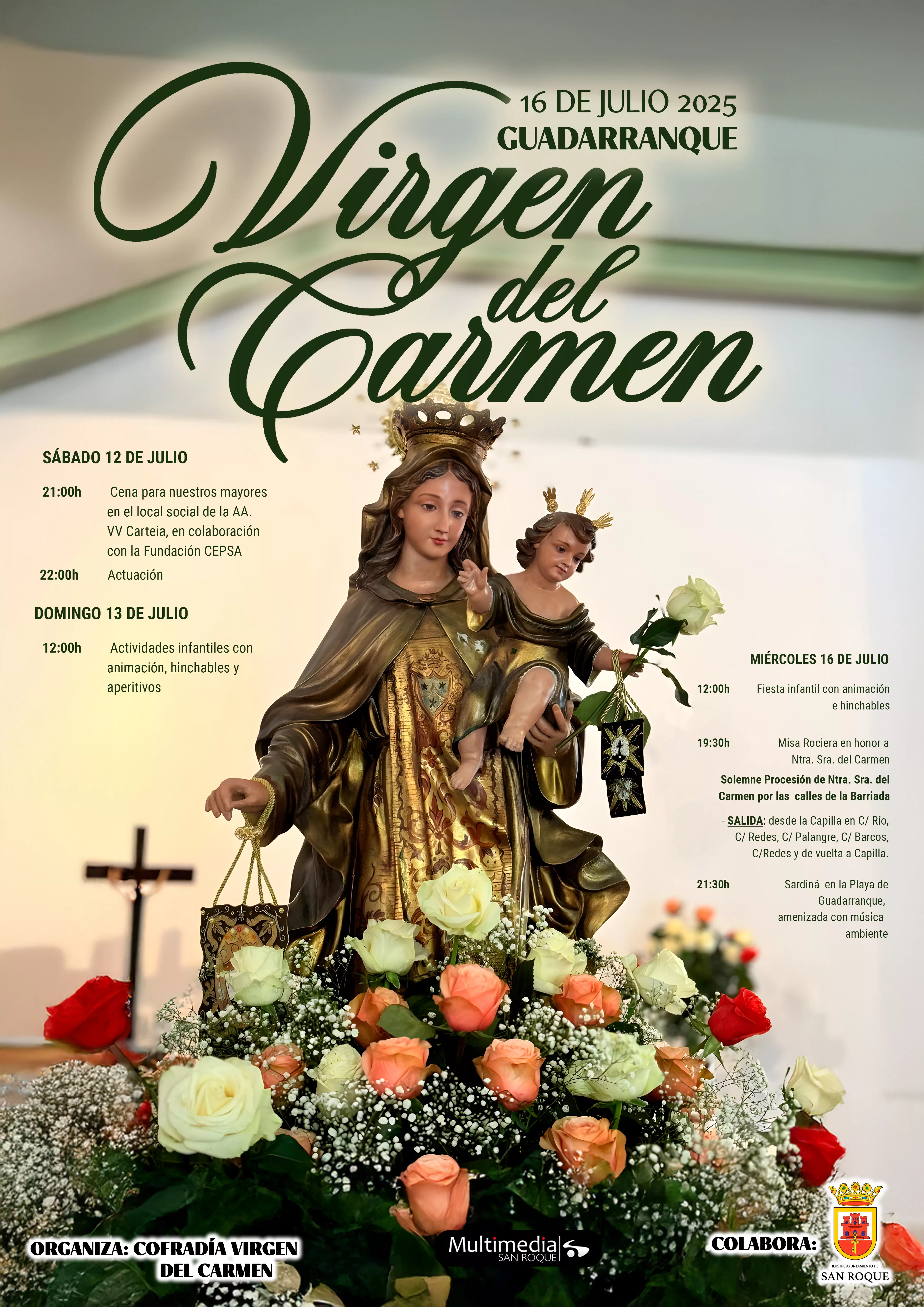 Además, el miércoles 16 de julio, día de la festividad, a las 12.00 horas se podrá disfrutar de una fiesta infantil. A las 19.30 horas se llevará a cabo una Misa Rociera, preámbulo de la Solemne Procesión de Nuestra Señora del Carmen por las calles de la barriada, cuya salida será desde la Capilla en calle Río. Por último, a partir de las 21.30 horas tendrá lugar la Sardiná en la playa de Guadarranque, amenizada con música ambiente.