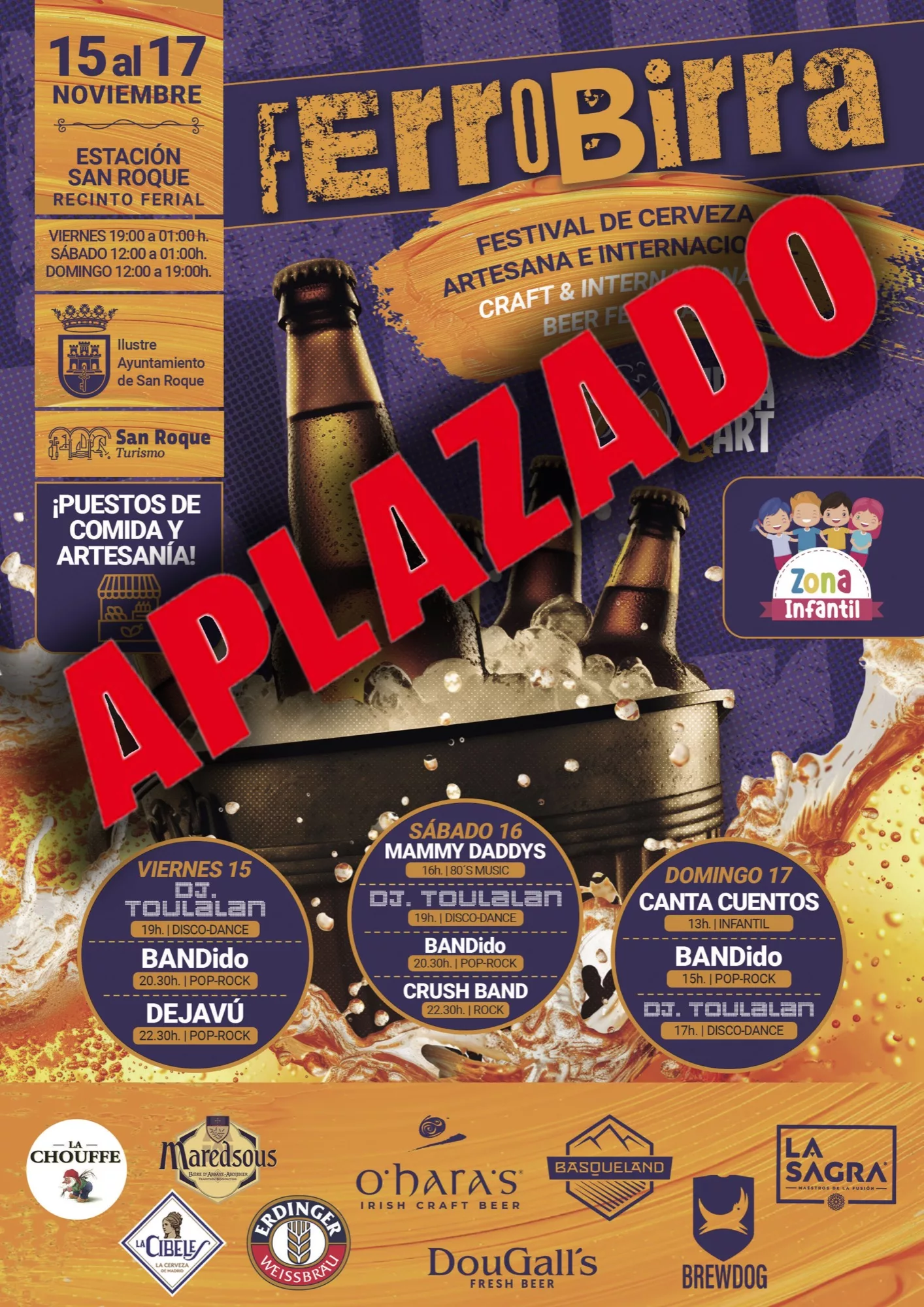 Debido a la situación actual de alerta amarilla y ante la previsión de más lluvias para los próximos días, desde la organización de FerroBirra, en la que participa el Ayuntamiento de San Roque, se ha decidido aplazar la celebración de este Festival de la Cerveza Artesana e Internacional. Esta actividad, que incluía conciertos y música de Dj así como la oferta de varias marcas de cerveza españolas e internacionales, tendrá lugar en fecha todavía por concretar.