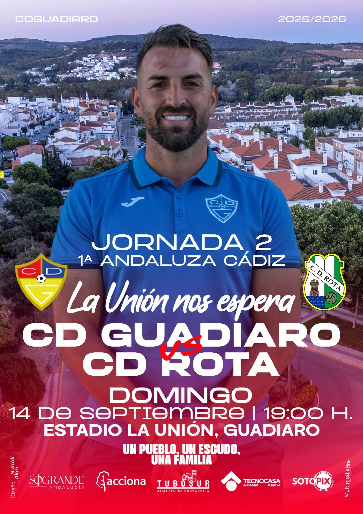 El Municipal La Unión albergará el próximo domingo, a partir de las 19.00 horas, el partido entre el CD Guadiaro y el CD Rota, correspondiente a la segunda jornada en Primera Andaluza Cádiz. El equipo granota comparecerá ante su afición con el objetivo de ganar tras la derrota del pasado domingo en Barbate, aunque su rival no es fácil a priori, ya que el domingo cosechó una victoria por 2 a 1 a su rival local, la Roteña UD.
