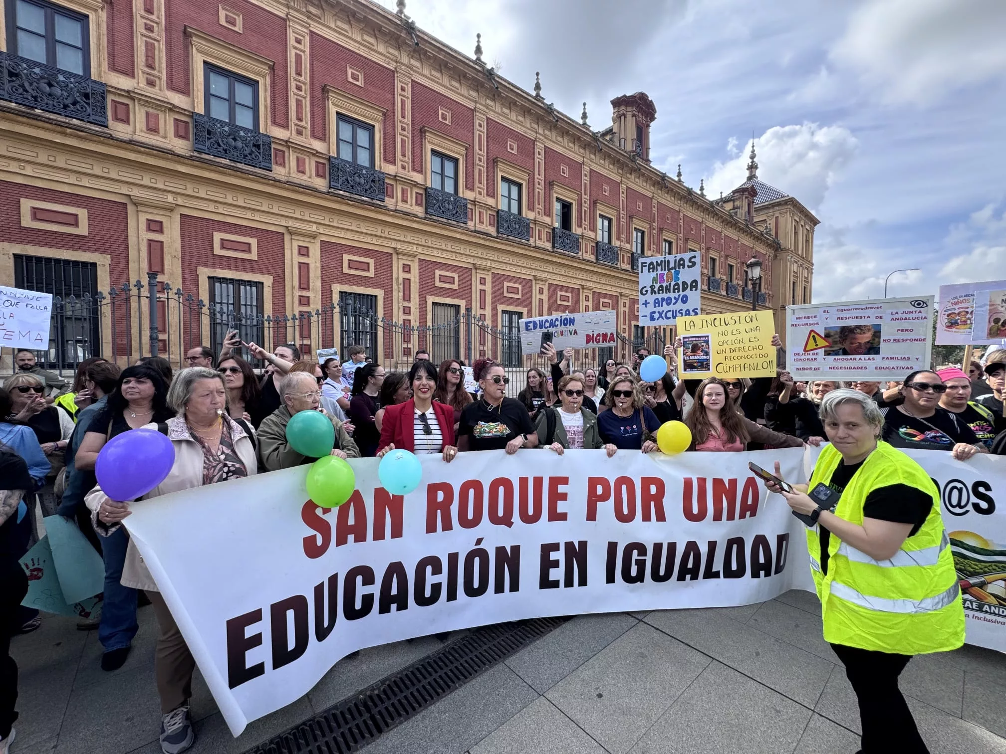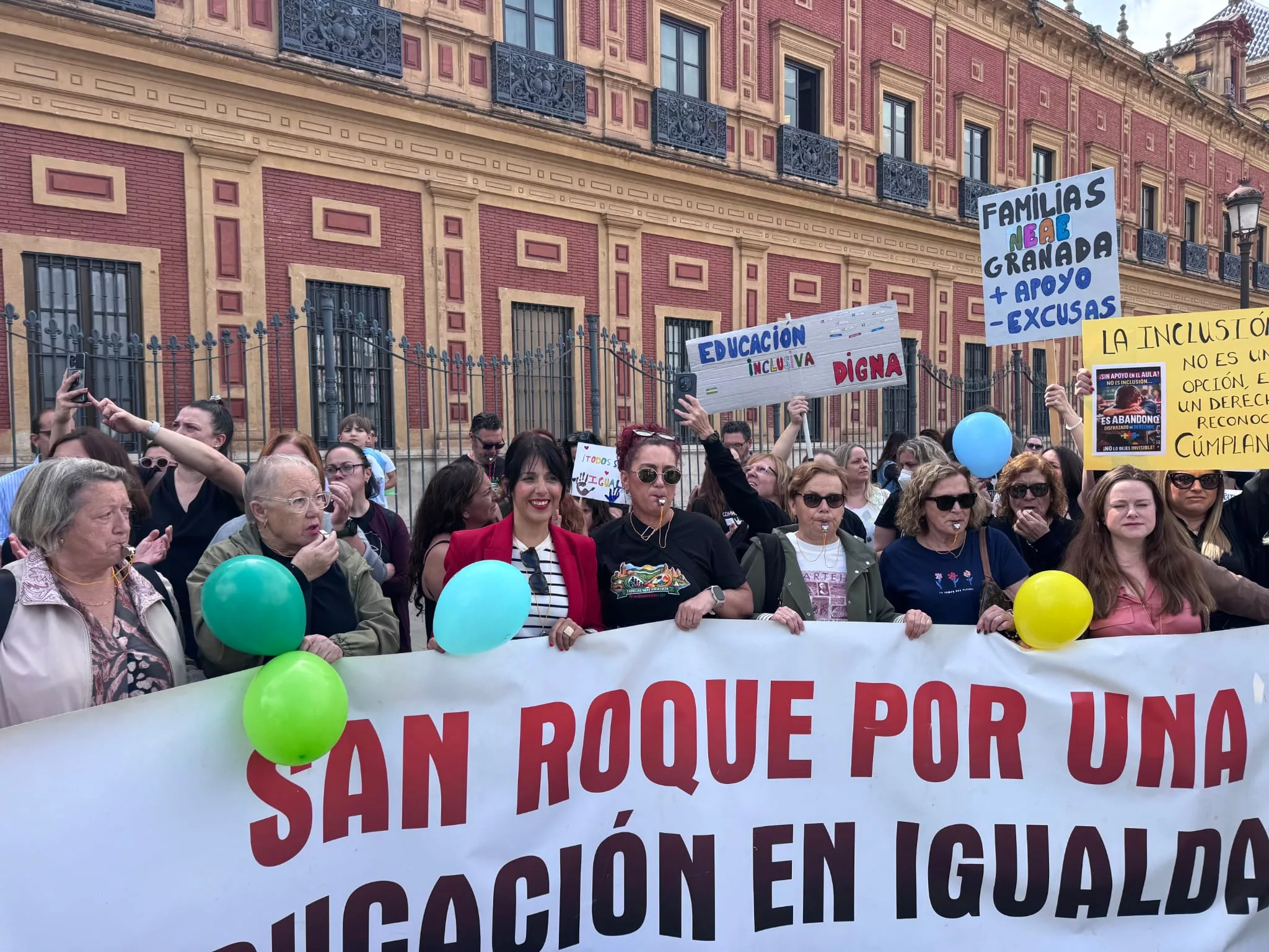 Las familias sanroqueñas se agrupaban tras una pancarta que decía “San Roque, por una educación en igualdad”, y junto a las del resto de las provincias andaluzas en sus mismas circunstancias demandaban más recursos para impulsar la educación inclusiva en Andalucía.