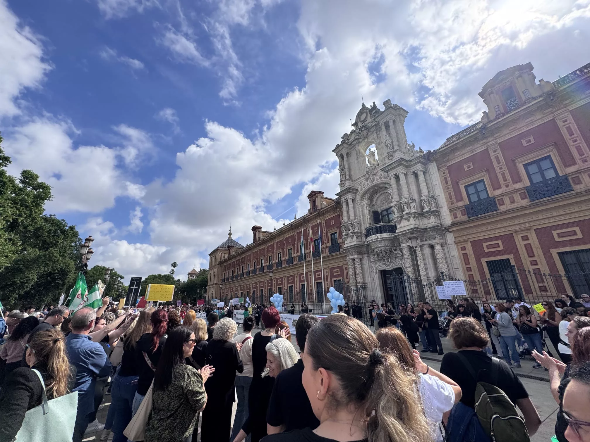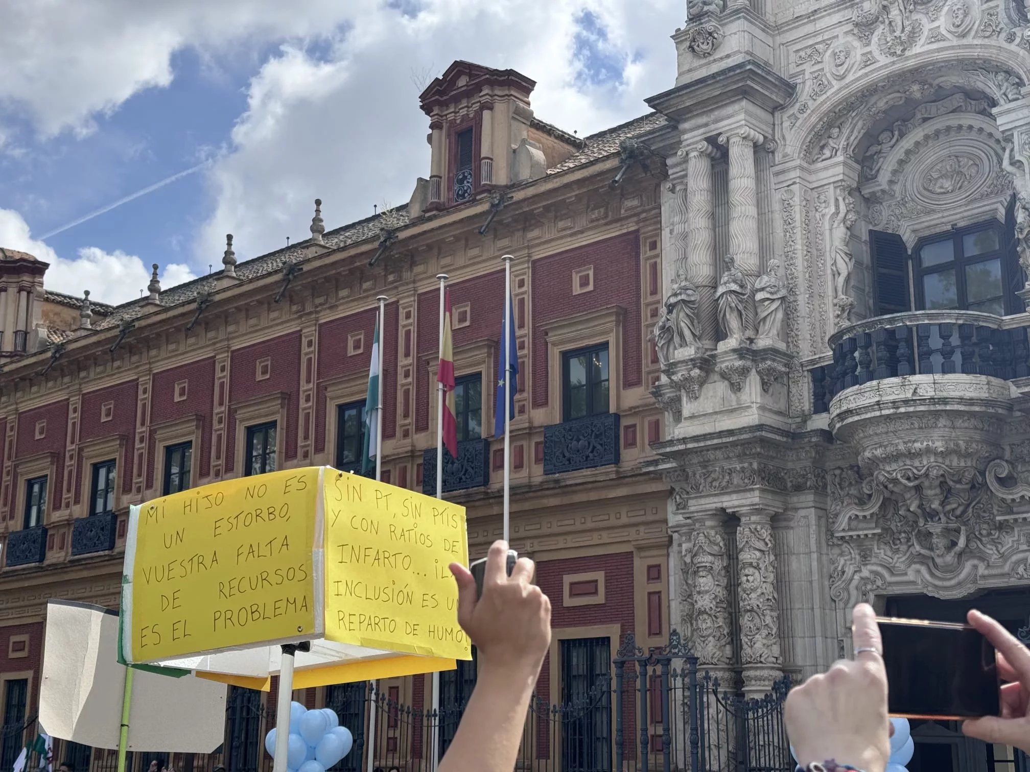 La puerta del Palacio de San Telmo, en Sevilla, ha acogido este jueves la segunda de las movilizaciones de las familias de alumnado con Necesidades Específicas de Apoyo Educativo (NEAE) que están realizando en toda Andalucía para exigir mejoras estructurales en la atención a la diversidad en el ámbito educativo, lo que es competencia de la Junta de Andalucía.