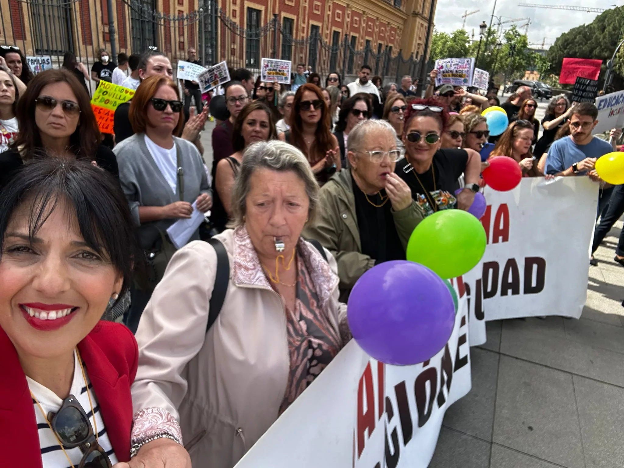 La teniente de alcalde de Educación, Belén Jiménez, y la concejal Rocío Fernández han asistido este jueves en Sevilla a la protesta de las familias de alumnado con Necesidades Específicas de Apoyo Educativo (NEAE) para exigir a la Junta de Andalucía mejoras en la atención de sus hijos en los colegios e institutos de la región.