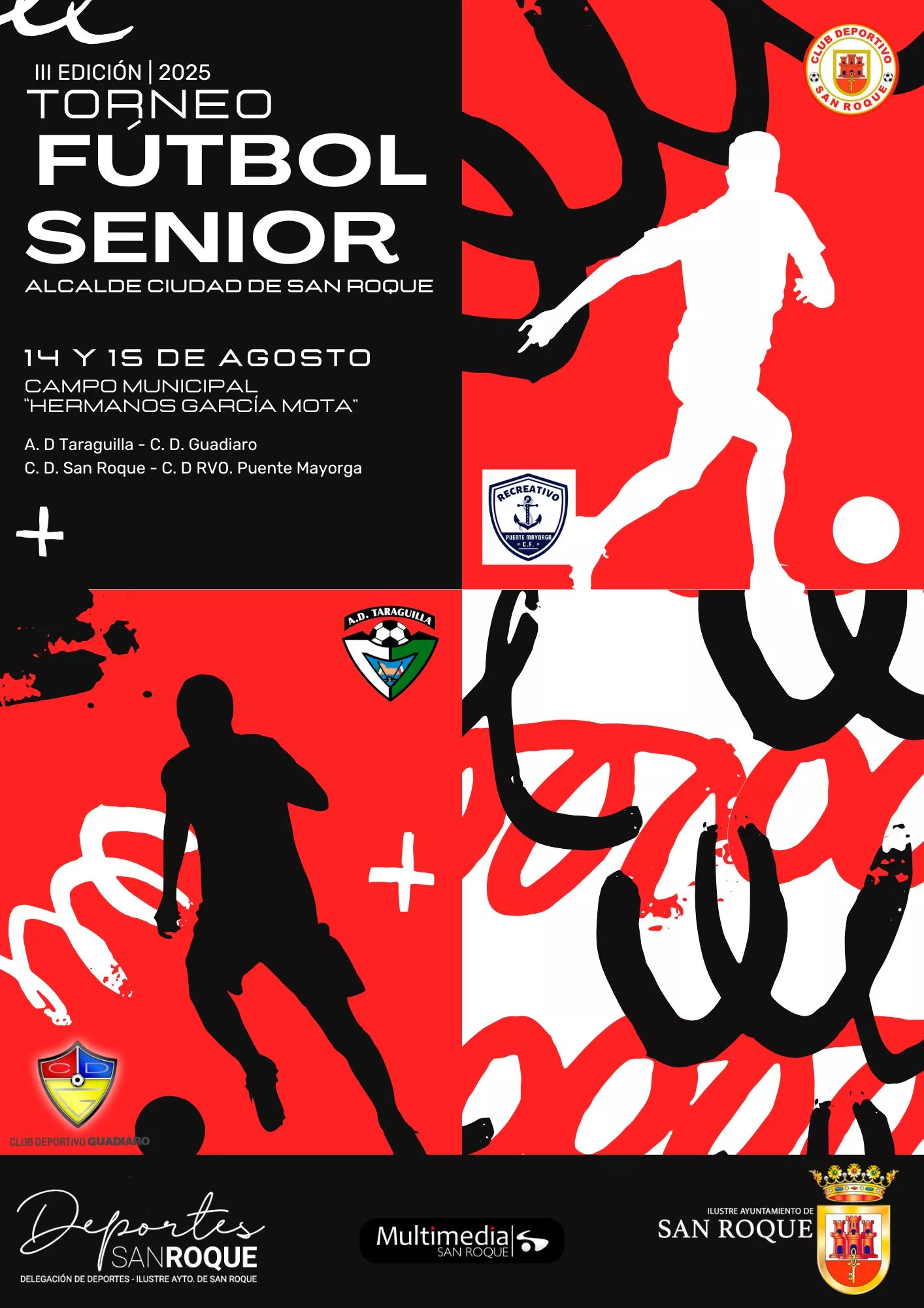El Municipal Hermanos García Mota acogerá este año el III Torneo de Fútbol Senior Alcalde Ciudad de San Roque, que organiza la Delegación de Deportes. El jueves 14 de agosto jugarán las semifinales el CD San Roque contra el Recreativo Puente Mayorga, y el CD Taraguilla con el CD Guadiaro. La final será en el mismo campo el viernes 15 a las 21.00 horas.