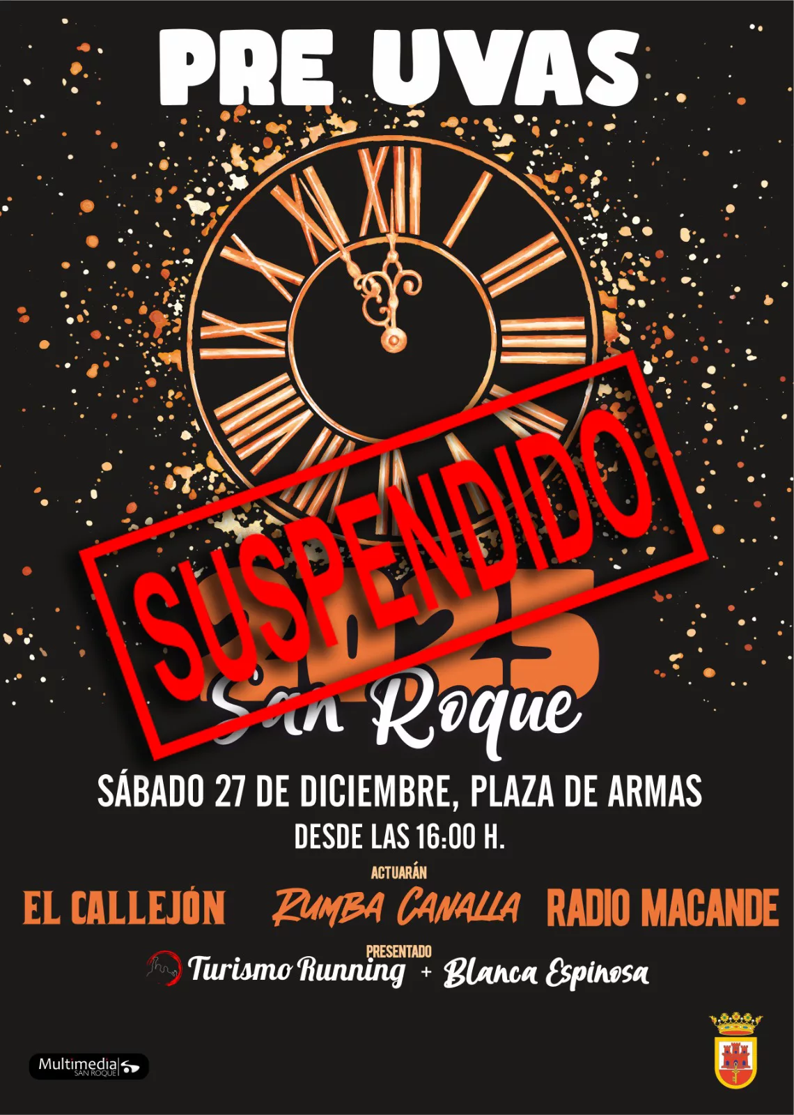 De esta manera, no se celebraran las Pre Uvas de San Roque casco en la tarde del próximo sábado 27 de diciembre en la Plaza de Armas, así como las Campanadas Infantiles que se iban a llevar a cabo al día siguiente, el domingo 28, también en horario de tarde y en la misma localización.
