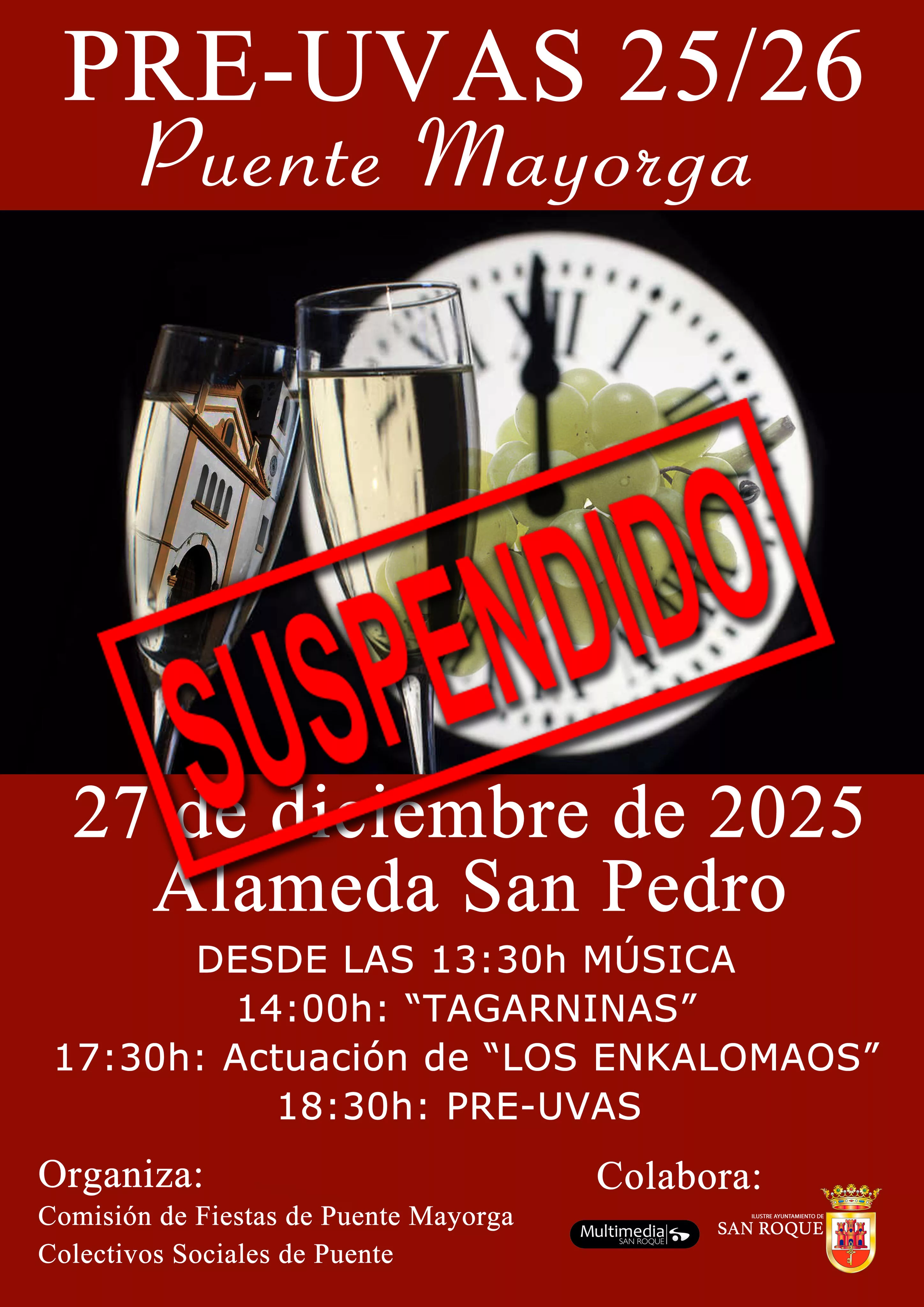 Por otro lado, también se ha decidido la suspensión de la fiesta Pre Uvas que la comisión de fiestas de Puente Mayorga, con la colaboración del Ayuntamiento, iba a celebrar en la Alameda San Pedro de esta barriada, el sábado 27 de diciembre por la tarde.