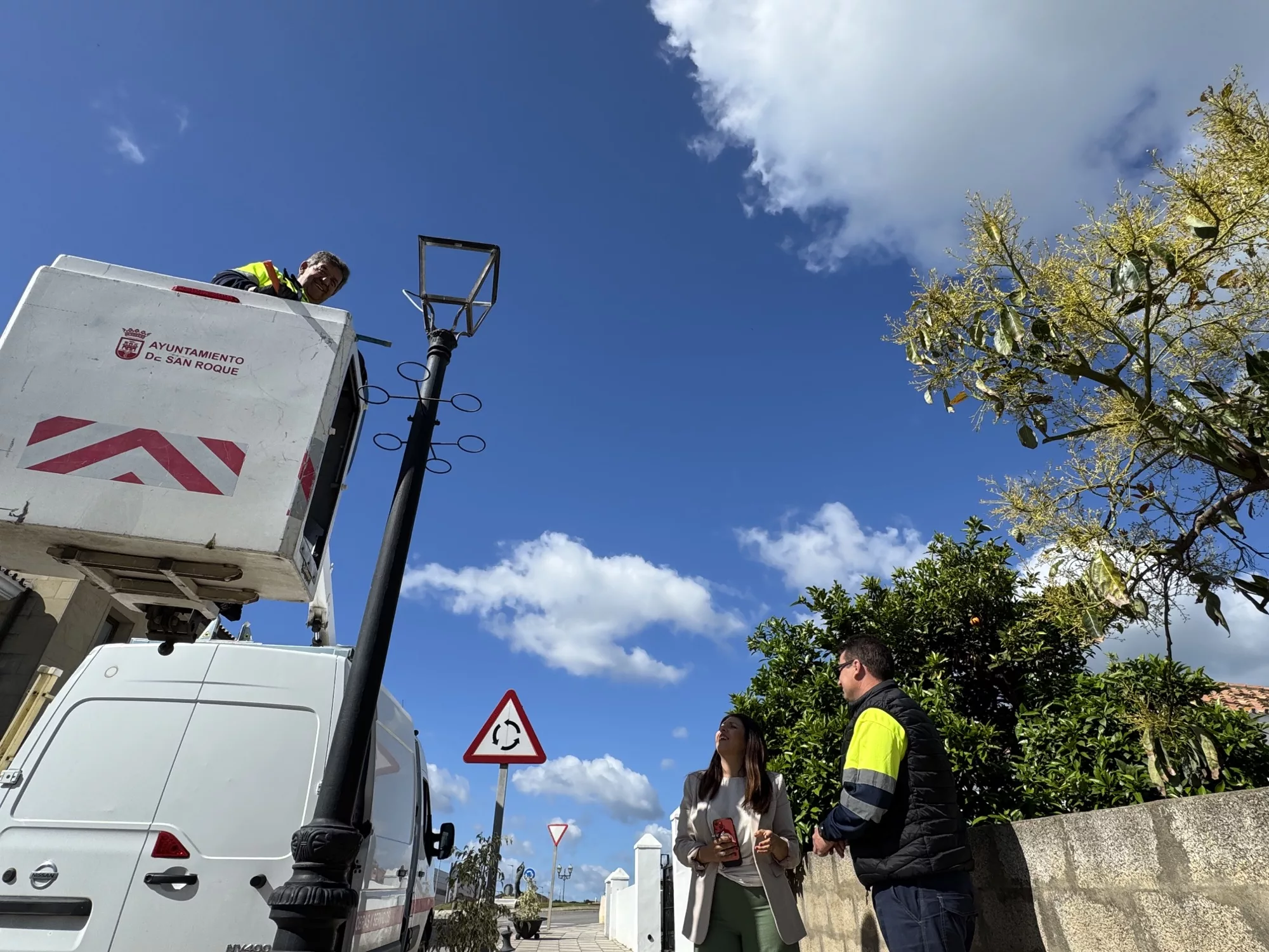 La Avenida Los Canos de Pueblo Nuevo de Guadiaro ya ha completado la sustitución de farolas de sodio a tecnología led con las últimas 34 luminarias instaladas a ambos lados de la vía. La teniente de alcalde de Obras y Servicios, Belén Jiménez, ha inspeccionado esta labor, que se realiza a través del departamento de Eficiencia Energética.