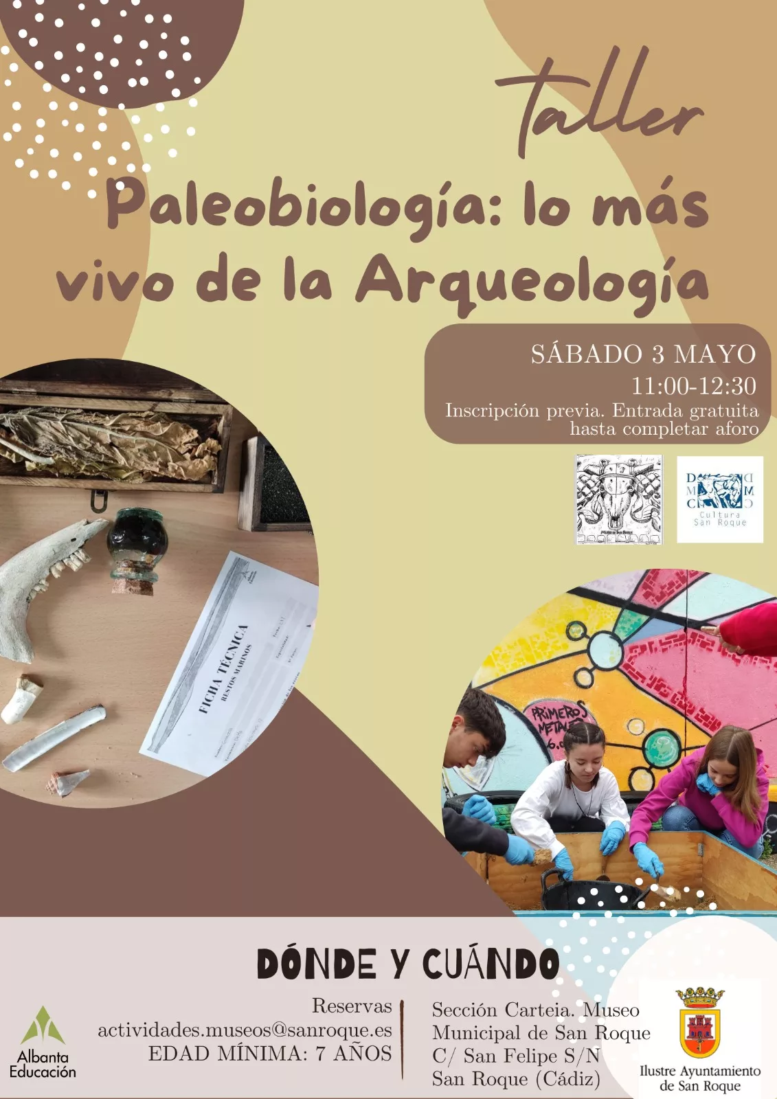 La Delegación Municipal de Cultura del Ayuntamiento de San Roque, en colaboración con el Museo Municipal y Albanta Educación, organizan el taller titulado “Paleobiología: lo más vivo de la Arqueología” dirigido a jóvenes mayores de 7 años. Este tendrá lugar el sábado 3 de mayo a partir de las 11:00 horas en el Museo Municipal de San Roque en la sección Carteia.