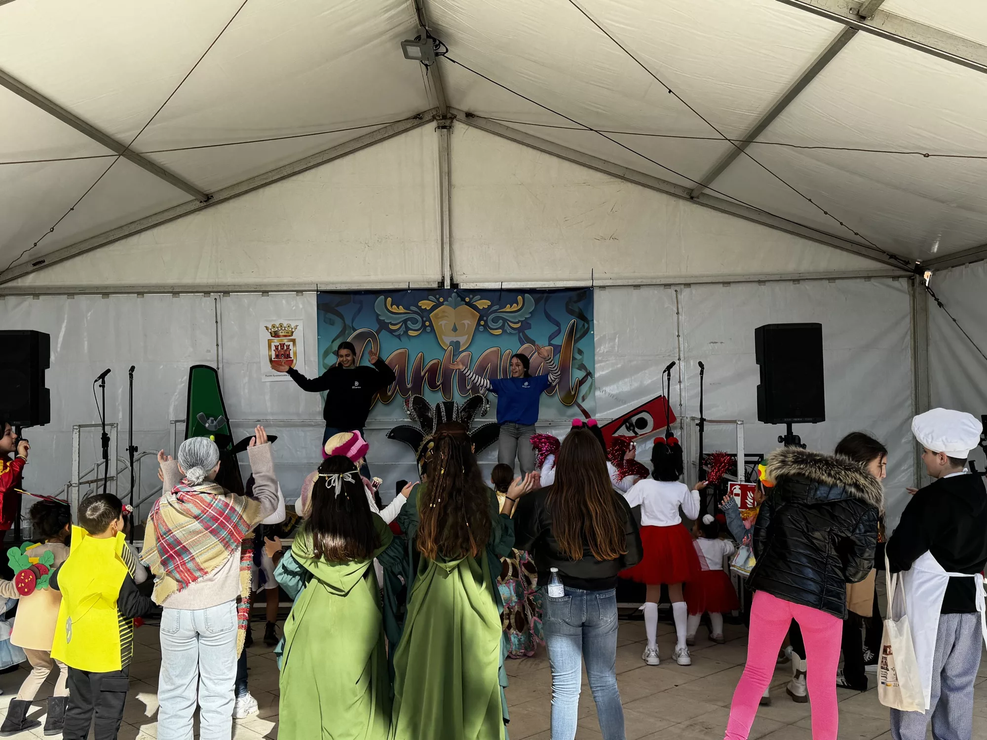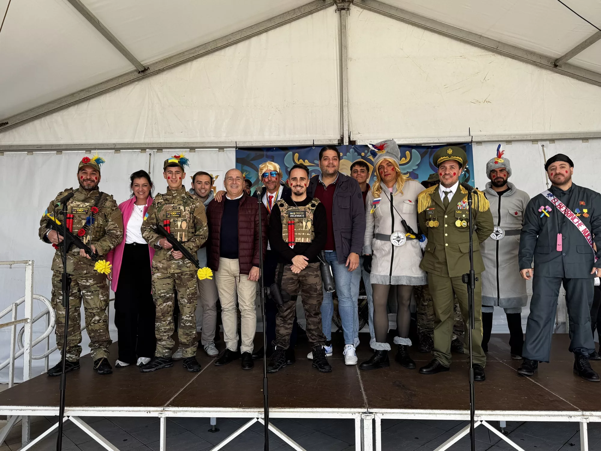 A mediodía comenzó la inscripción del concurso de disfraces infantil, con un grupo de animación posterior. A las 13.30 horas actuó la agrupación carnavalesca “Sin novedad en el frente, los hijos de Putin”. Previamente comenzaba el jurado a deliberar con la presencia de los concursantes infantiles.
