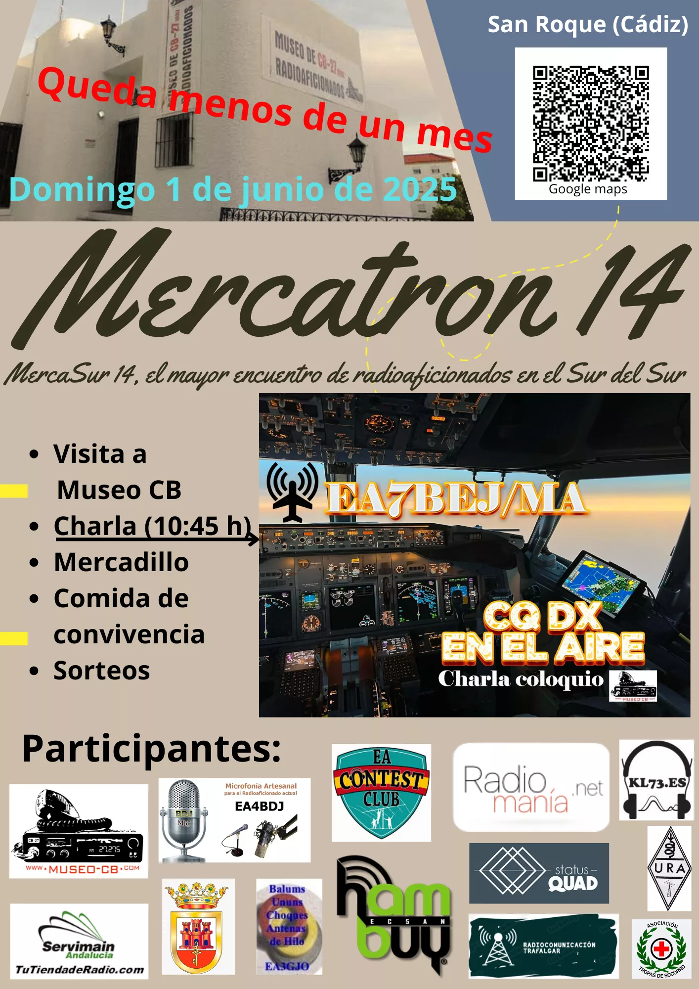 La Asociación Pro Museo CB de San Roque (Cádiz) y el Ayuntamiento de San Roque ya tienen todo listo para la 14 edición de Mercatron, el mayor encuentro de Radioaficionados en el sur de Andalucía. Será en la mañana del domingo 1 de junio de 2025 en la Alameda Alfonso XI.