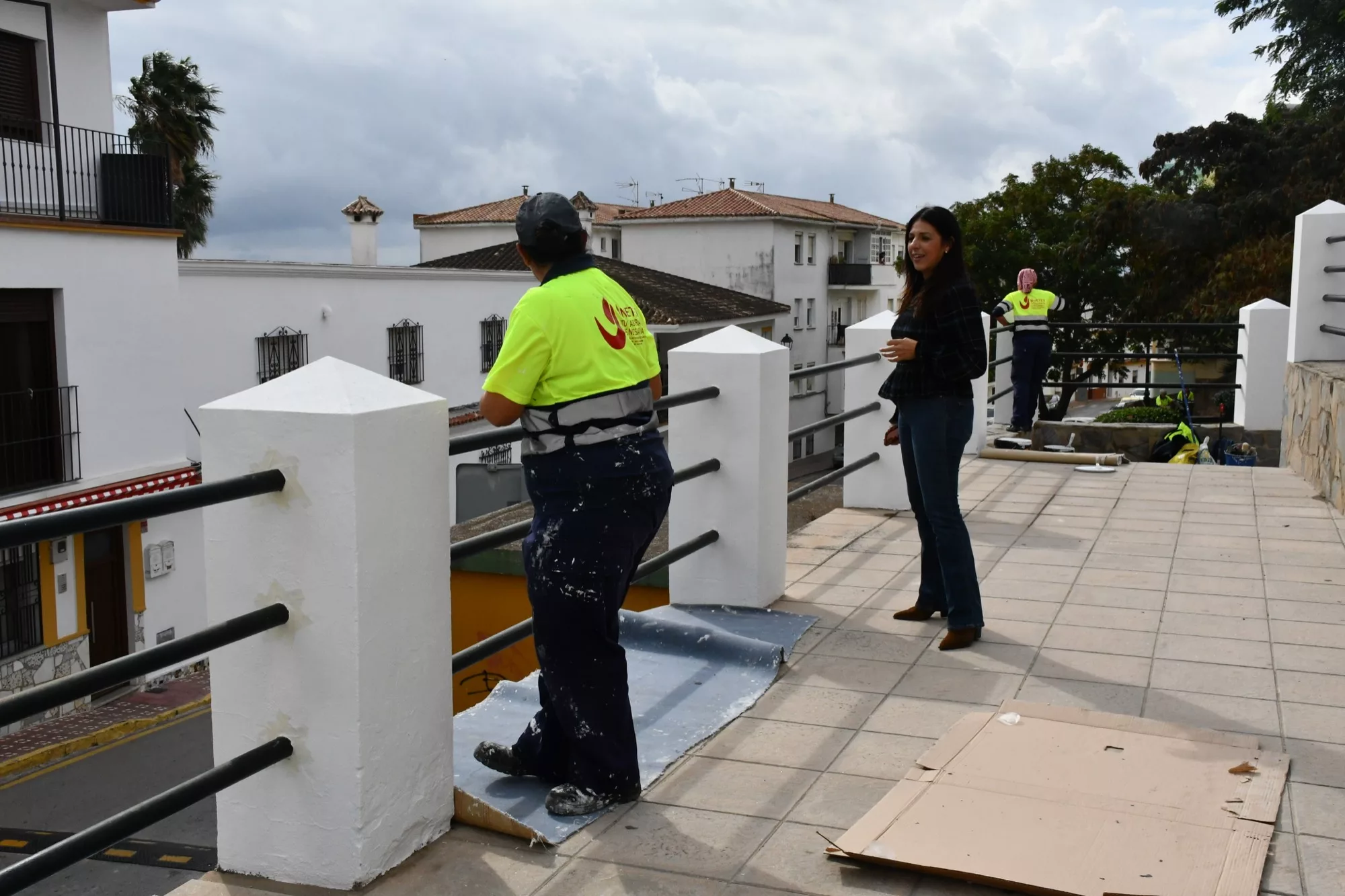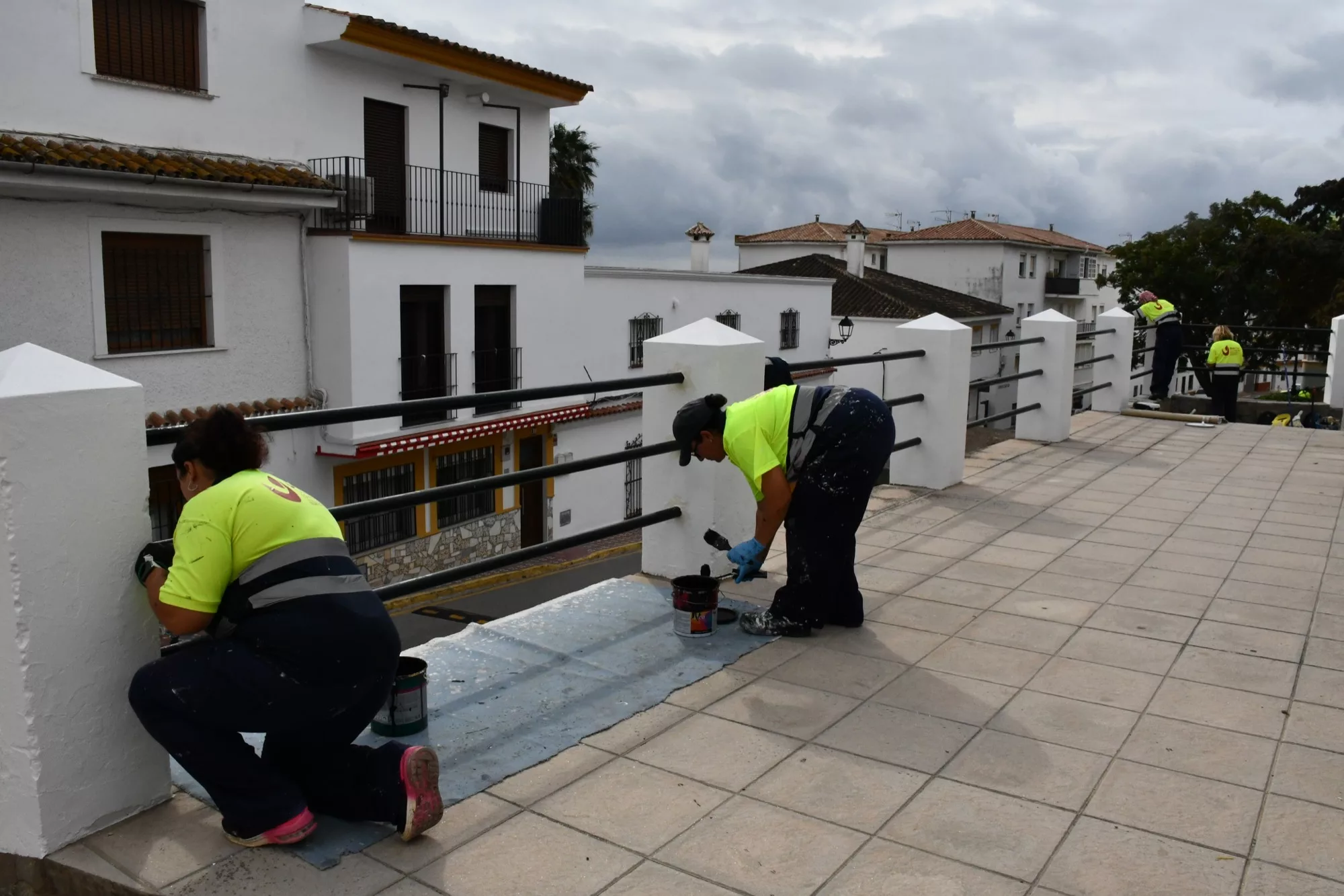 Desde el Departamento de Pintura y Rehabilitación de la Delegación de Obras y Servicios, que dirige la teniente de alcalde Belén Jiménez, se está llevando a cabo trabajos de pintura en las columnas y barandillas que se encuentran en la zona más baja de la calle San Francisco, que confluye con la calle Constitución de la ciudad de San Roque.
