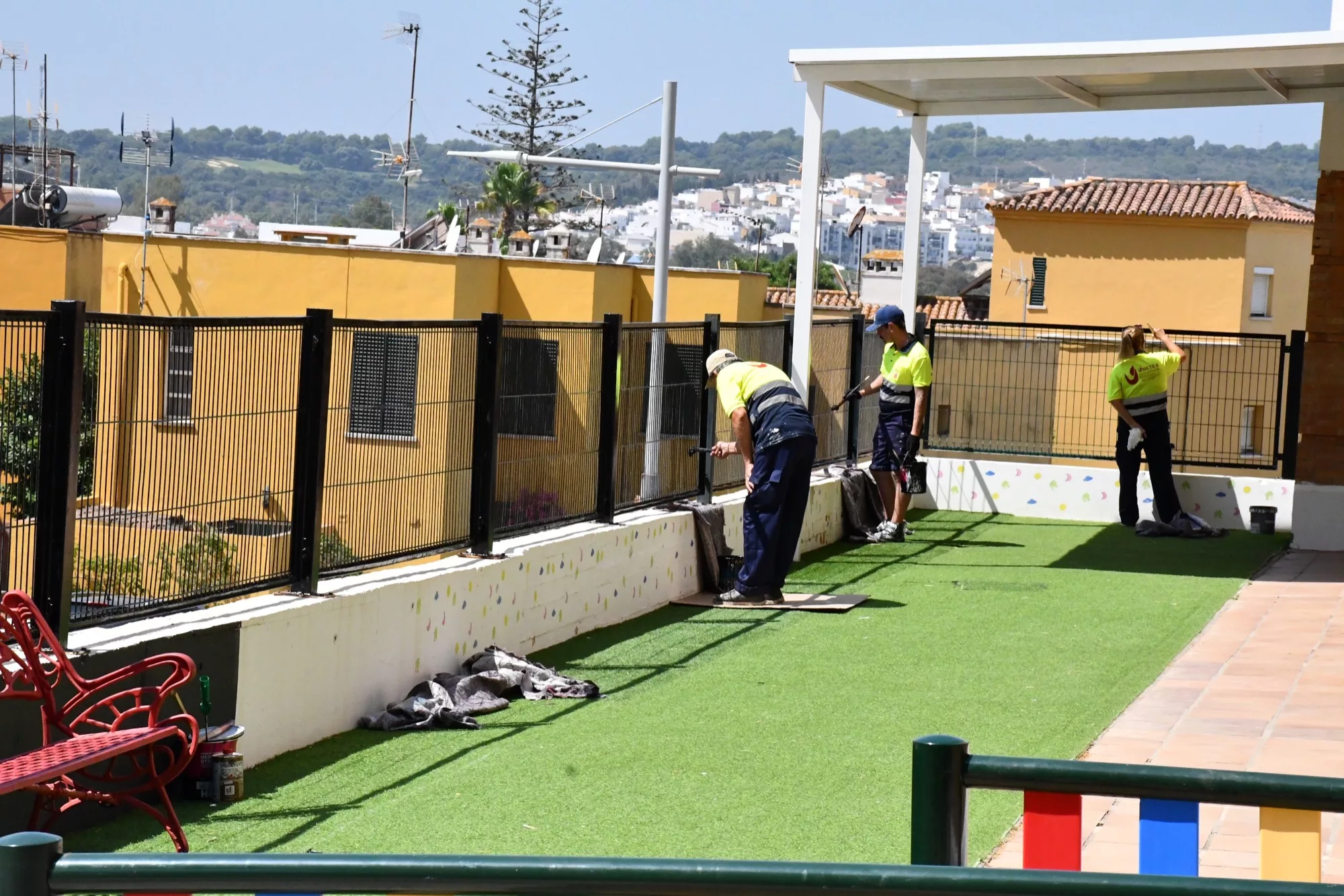 La teniente de alcalde de Obras y Servicios y de Educación, Belén Jiménez, explicó que durante el verano se pintaron los interiores de los centros, y en la actualidad se está trabajando en las zonas exteriores. Recordó que esta labora se puede acometer gracias al refuerzo que suponen los 185 operarios contratados por seis meses desde diciembre pasado a través del plan de empleo de Emadesa, una inversión municipal por importe de millón y medio de euros.