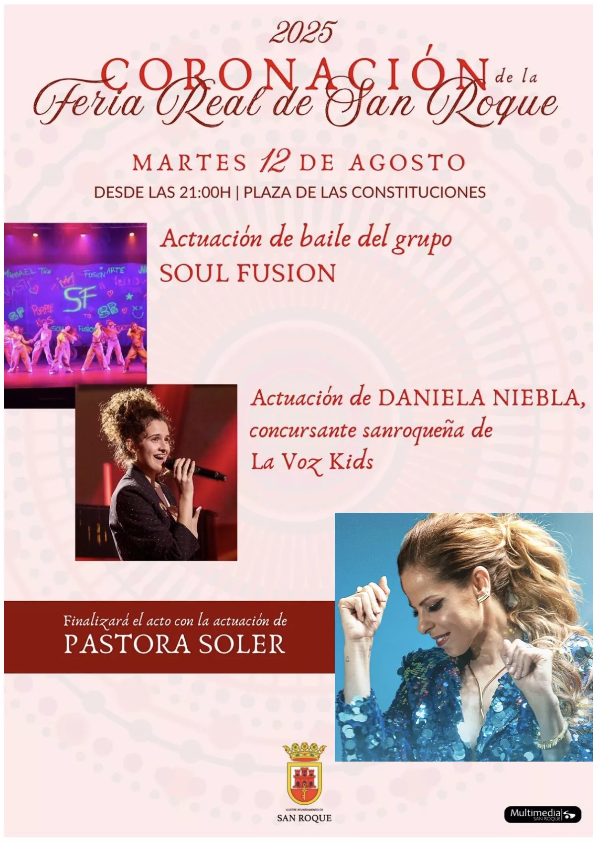 El Gran Acto de Coronación de las Reinas de la Feria Real de San Roque, que tendrá lugar el próximo martes 12, incluirá tres grandes actuaciones: la del grupo de baile Soul Fusion; la de la jovencísima sanroqueña Daniela Niebla; y el broche de oro que pondrá Pastora Soler.