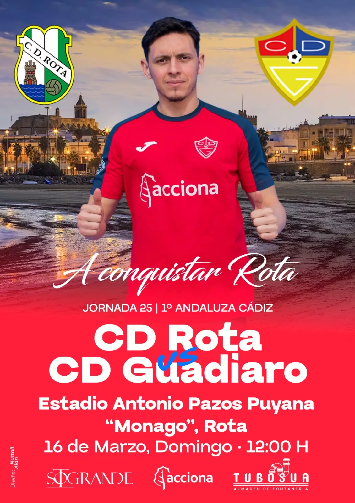 El Club Deportivo Guadiaro viaja este fin de semana para disputar los tres puntos en juego ante el Club Deportivo Rota, un equipo bien asentado en la tabla de Primera Andaluza gaditana, aunque en un campo de las dimensiones óptimas para que el equipo de Sergio Mena consiga traerse los deberes hechos. El encuentro que se prevé muy igualado, dará comienzo a mediodía del domingo y lo dirigirá el colegiado Bernárdez Pérez.