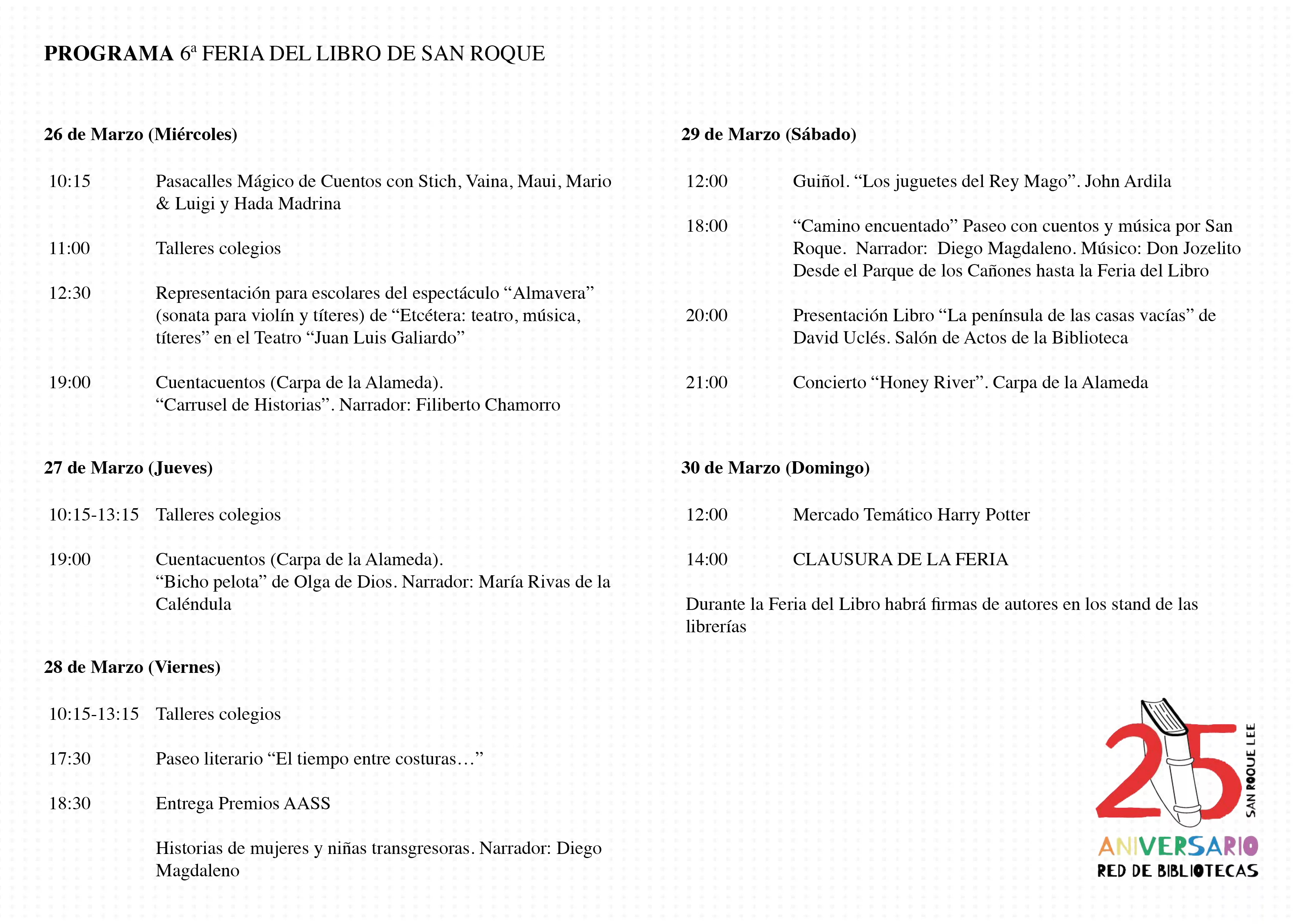 La sexta Feria del Libro de San Roque comenzará el próximo miércoles 26 de marzo con un Pasacalles Mágico de Cuentos. El certamen se prolongará hasta el domingo 30 de marzo y contará con firmas de autores, talleres, representaciones teatrales, cuentacuentos y un Mercado Temático Harry Potter con el que finalizará esta nueva edición.