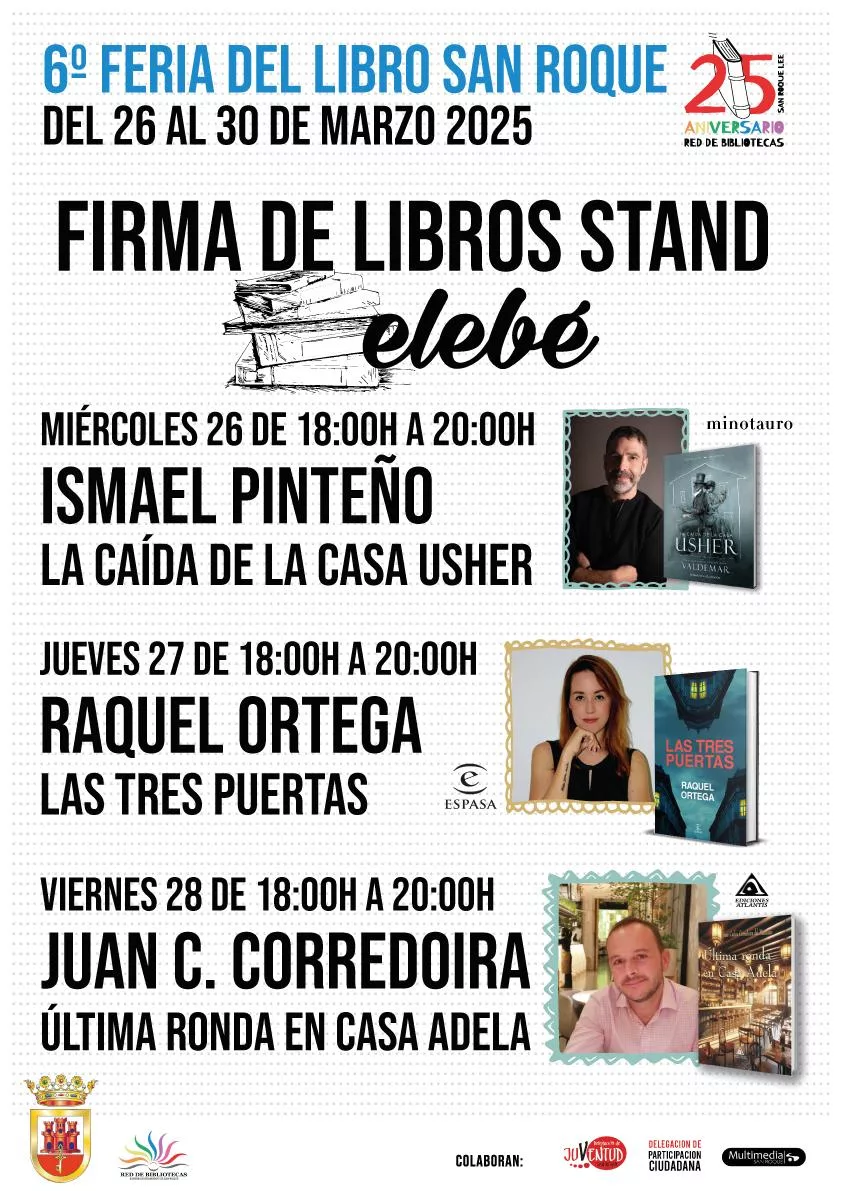 Durante todos los días de feria habrá firma de libros en el “stand” de la librería Elebé, así el miércoles 26, desde las 6 a las 8 de la tarde, el escritor Ismael Pinteño firmará su obra “La caída de la casa Usher”. El jueves 27 será el turno de Raquel Ortega que firmará ejemplares de “las tres puertas”, en el mismo horario de tarde de 6 a 8 de la tarde, al igual que el viernes 28, Juan C. Correidora firmará su obra “Última ronda en casa de Adela”.