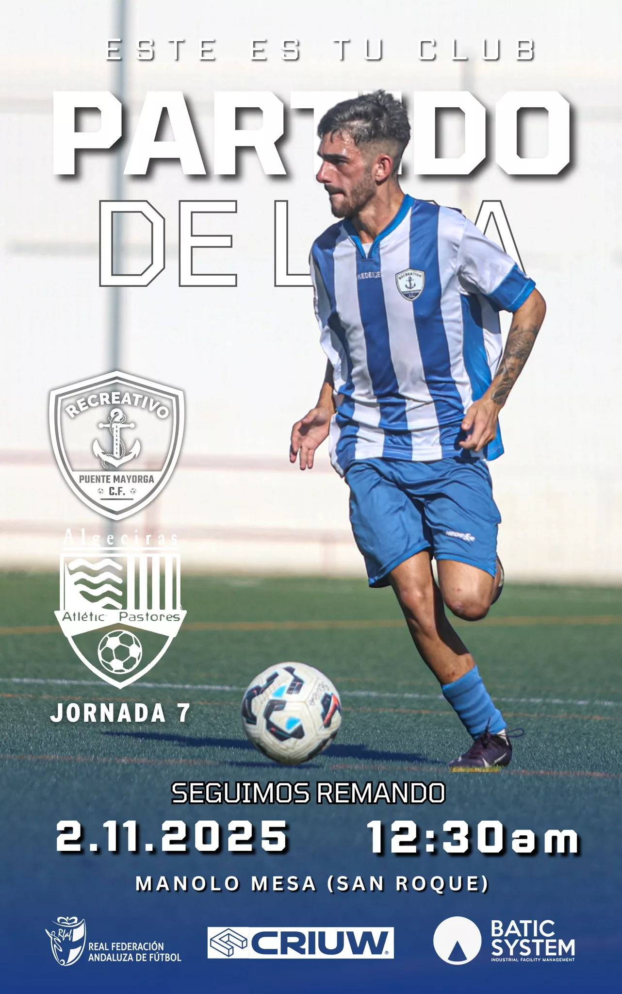 El Recreativo Puente Mayorga Club de Fútbol, que ocupa el segundo puesto del grupo primero de Tercera Andaluza Cádiz, tiene el objetivo de seguir escalando en la clasificación en su envite contra el Club Deportivo Atlético Pastores de Algeciras. El partido será este domingo a las 12:30 horas en el Manolo Mesa y lo dirigirá el trencilla Jiménez Sánchez.