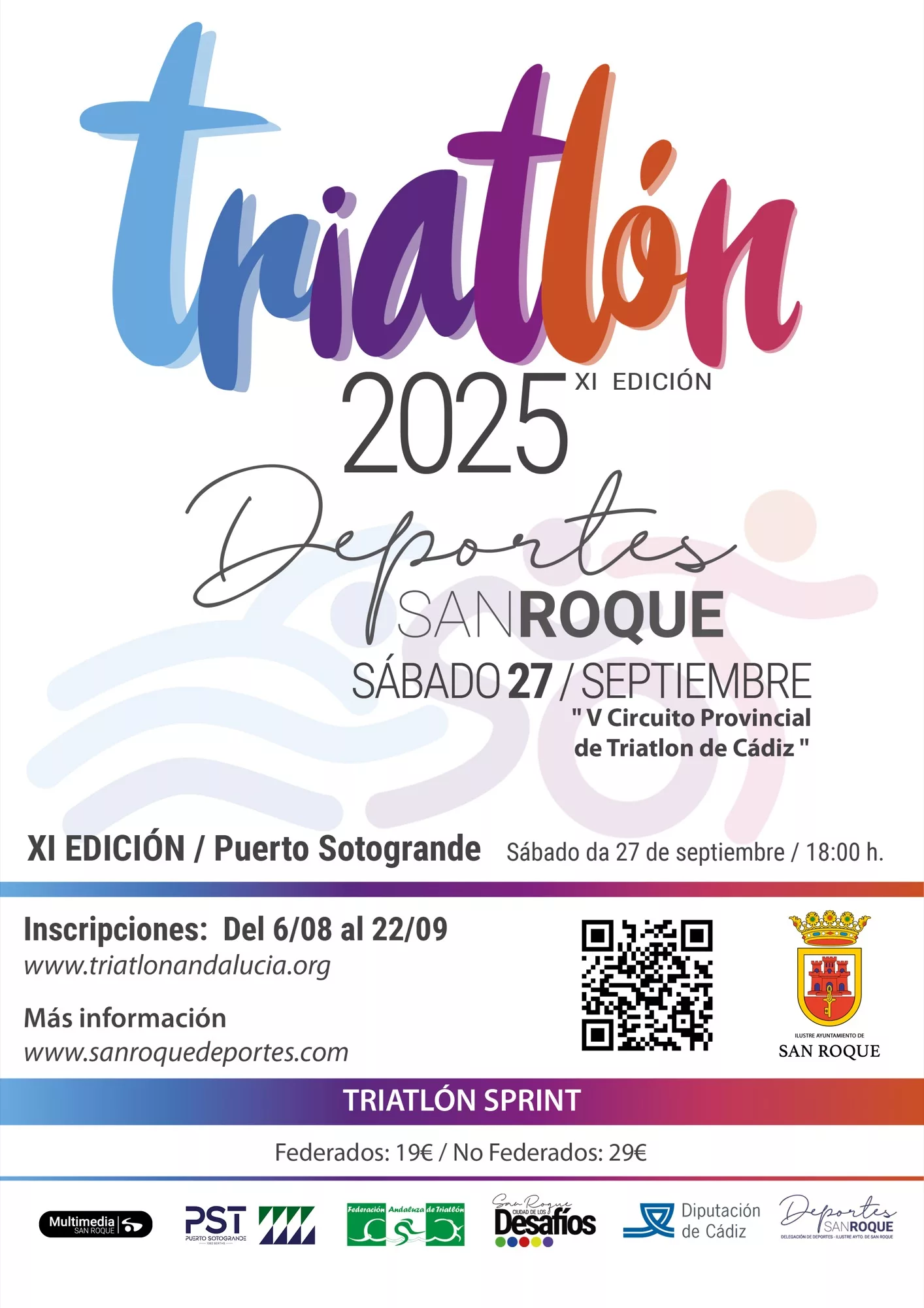 A las 16.00 horas se reabrirá la carpa de entrega de dorsales, y a las 18.00 comenzará el XI Triatlón-Sprint San Roque 2025 propiamente dicho. En primer lugar se desarrollará el segmento de natación, con salida y llegada en la playa de Torreguadiaro y con una distancia de 700 metros. A continuación se desarrollará el segmento de ciclismo, sobre una distancia de 20 kilómetros, con salida y llegada en el Paseo Marítimo de Torreguadiaro y atravesando distintos puntos de Sotogrande y Puerto Sotogrande. Finalmente tendrá lugar la carrera a pie, de 5 kilómetros de distancia, con ida al Hotel Milla de Plata y vuelta hasta la zona de salida. La entrega de trofeos esta prevista para las 20.30 horas.
