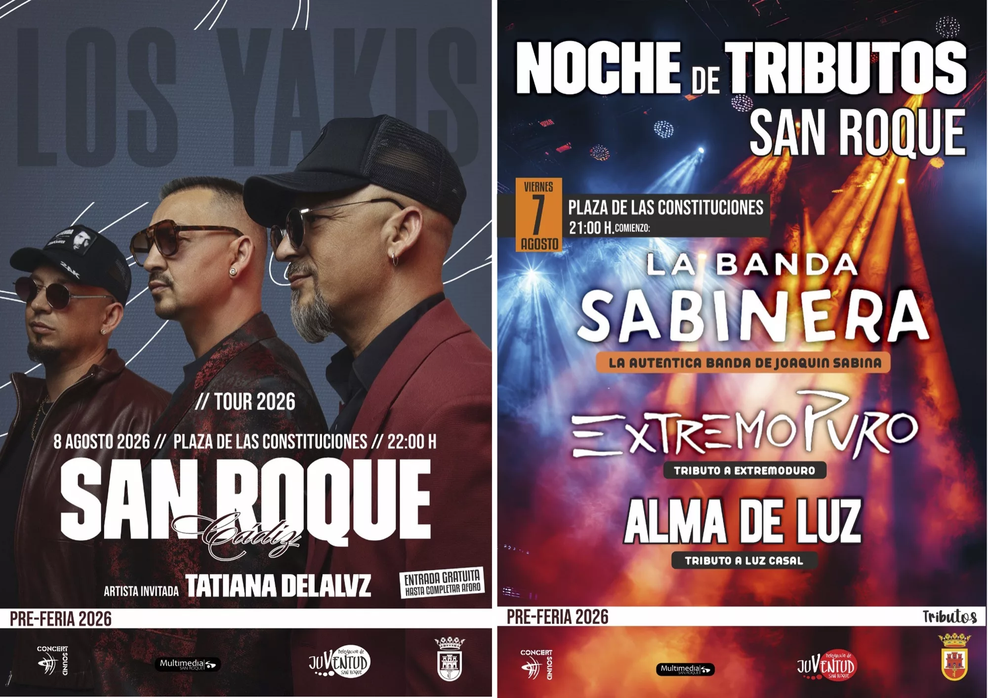 La Delegación de Juventud del Ayuntamiento de San Roque organiza dos conciertos pre-feria para el viernes 7 y para el sábado 8 de agosto con los que calentar motores de cara a la Feria Real 2026, cuyo Acto de Coronación será el martes 11. La banda que acompaña a Joaquín Sabina y la salsa flamenca de Los Yakis encabezarán los carteles en ambas jornadas.
