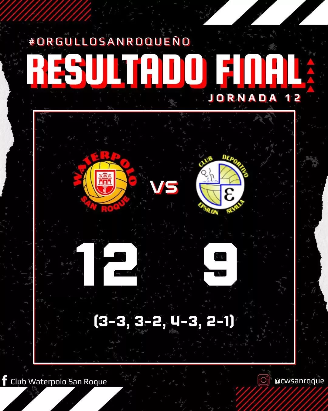 El Waterpolo San Roque sumó el pasado sábado una nueva victoria al derrotar en casa al colista, el CD Epsilon Sevilla en un partido que comenzó igualado pero que fue evolucionando de manera positiva para los locales. El resultado final fue de 12 a 9, y los sanroqueños van octavos en la 39 Liga Andaluza de Primera División.
