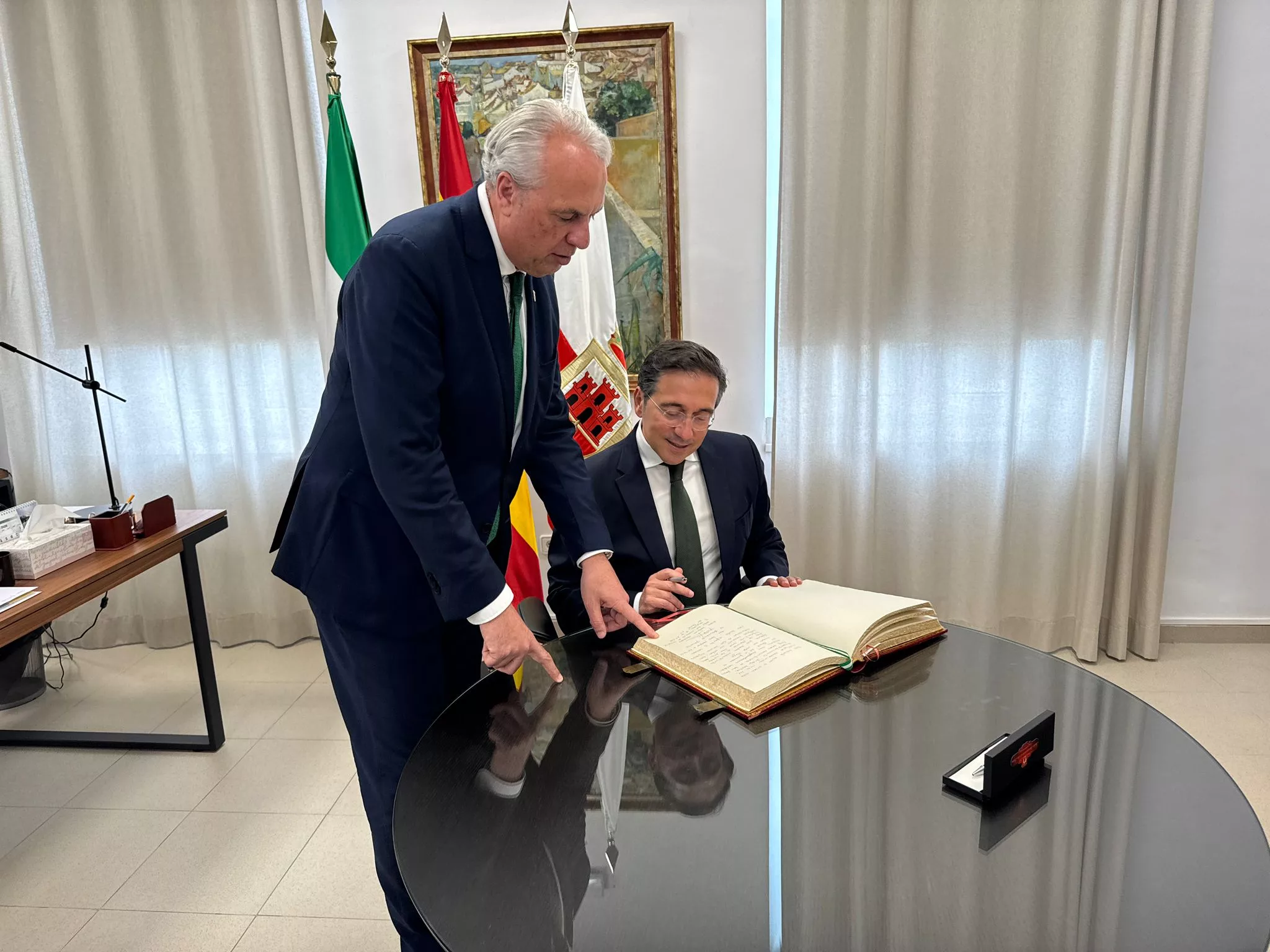 Albares ha tenido la oportunidad de firmar el Libro de Oro del Ayuntamiento, donde ha podido ver las firmas de destacados personajes de la cultura, la política y otros campos que han pasado por San Roque.