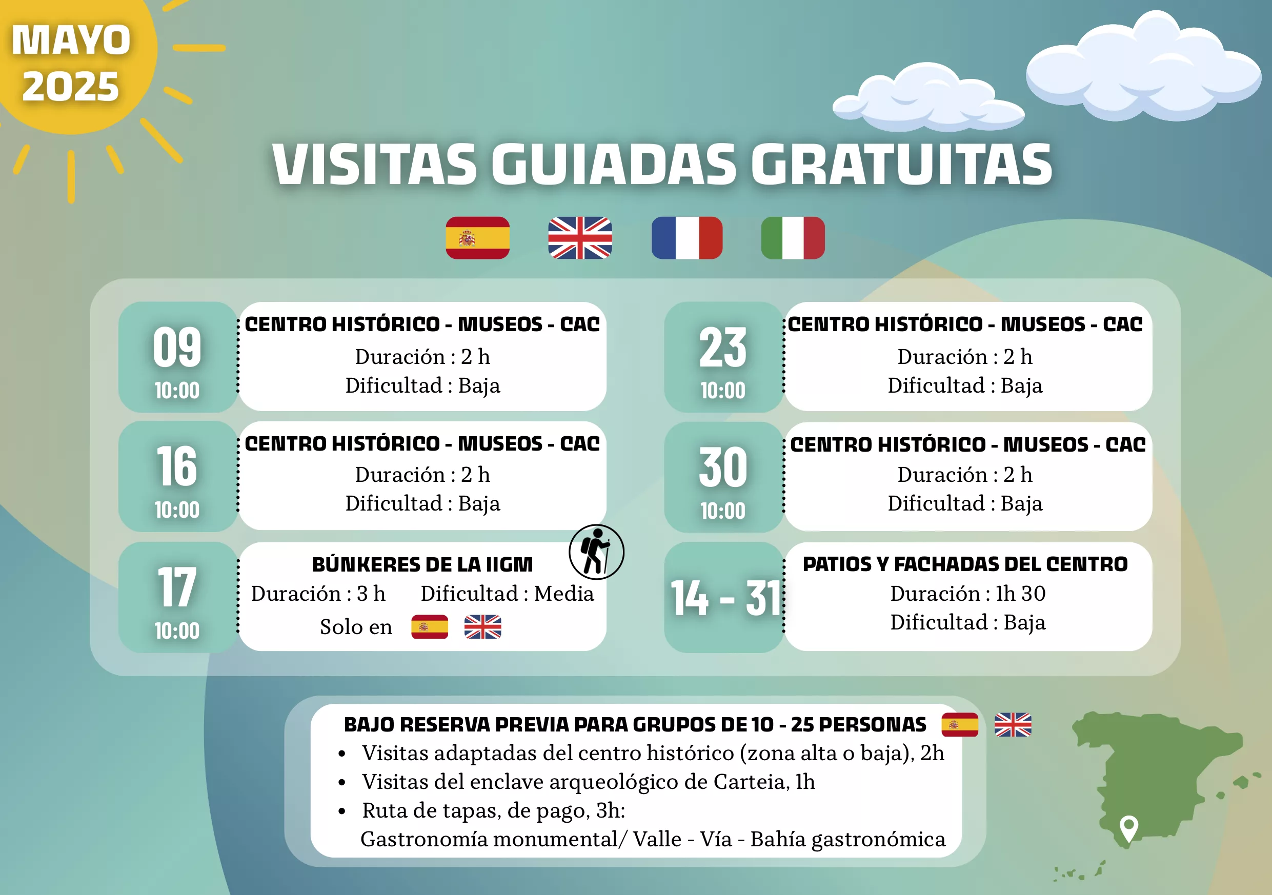 Desde la delegación de Turismo, bajo reserva previa y para grupos de 10 a 25 personas, también están disponibles visitas adaptadas al Centro Histórico, en la zona alta y baja, de dos horas de duración, visitas al Enclave Arqueológico de Carteia, de una hora de duración, y Rutas de tapas, de pago, de 3 horas de duración, entre ellas, Gastronomía Monumental, en el Valle del Guadiaro, Vía y Bahía Gastronómica, tanto en inglés como en español.