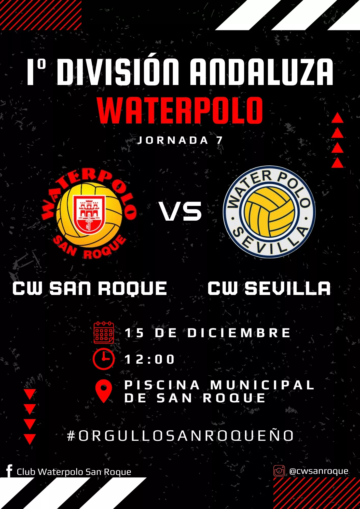 Waterpolo San Roque recibe este domingo 15 de diciembre a Waterpolo Sevilla, en la séptima jornada de Liga de la Primera división andaluza. El partido dará comienzo a las 12 del mediodía den la Piscina Municipal de San Roque.